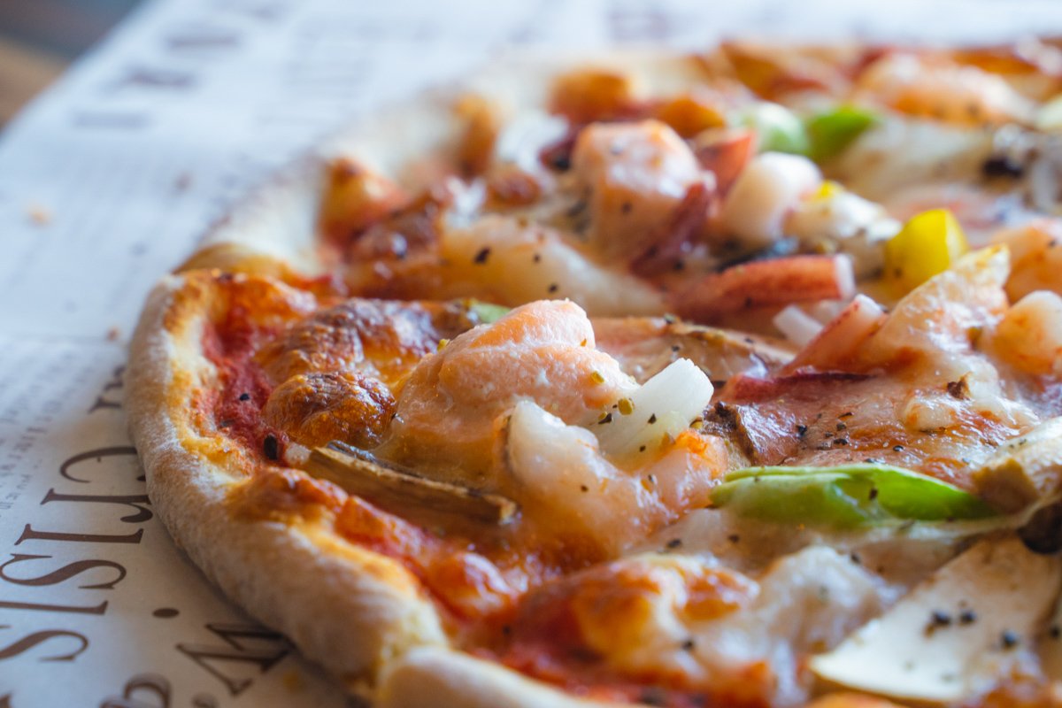 第一站午餐先來吃個道地「披薩老爹」吧!由起司、鮭魚、小捲、蟹肉、洋蔥、甜椒、黑橄欖、香菇&手工蕃茄醬製成的「主廚特製」披薩,是相當道地的義式披薩,豐富的配料讓每一口都有著不同的驚喜。老闆希望能將義大利傳統薄皮披薩介紹給台灣人,透過美食和大家互動的同時,也可以順便讓大家認識他的國家,這對老闆來說就是百分百的幸福。