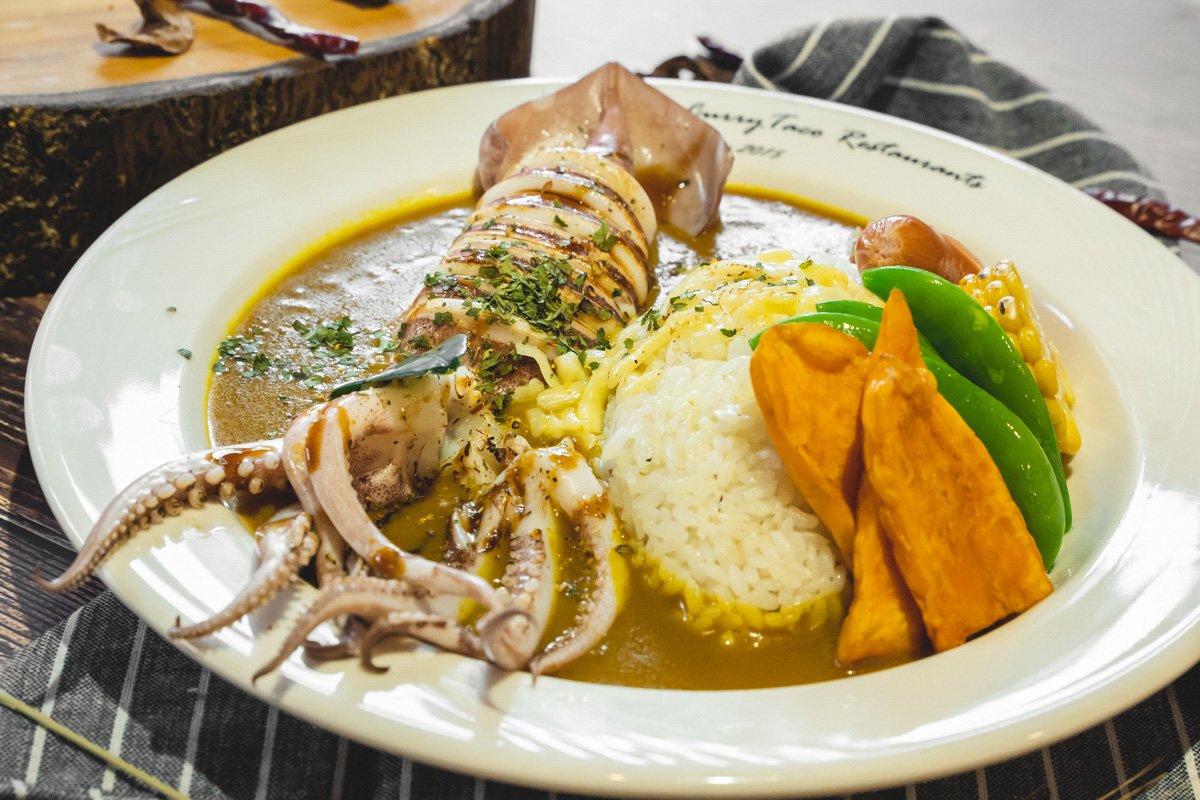 最後一站來到「墨魚廚房」,他是一間以咖哩為主的餐廳,除了日式甜咖哩外,還可以選擇印度辣咖哩or泰式綠咖哩。Rocky是一個非常熱愛研究香料的人,因此店內的調味料(包含咖哩)都不會用料理包下去處理,在數十種香料中精心挑選並層層疊加,這些咖哩才有著屬於Rocky的味道。「那霸琉球甜咖哩襯主廚墨魚」是日式咖哩風味,吃起來最為爽口,怕辣的妞妞也可以列入口袋名單!