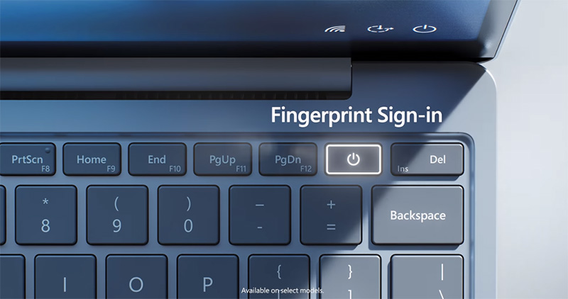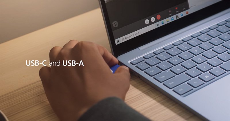 Microsoft 在 Surface Laptop Go 上僅配有 1 個 USB-C 和 1 個 USB-A 連接埠,另外還有 1 個耳機孔和 Surface Connect 充電孔。前方則配有一個 720p 網路攝影機,但它並不支援 Windows Hello 人臉辨識功能。Microsoft 已將指紋辨識器整合到部分型號 Surface Laptop Go 的電源按鈕中,你可以在啟動、喚醒同時用手指登入 Windows,基本款並未配備指紋辨識器,如果你有指紋解鎖 / 鎖定的需求,則需採購較高規版本。