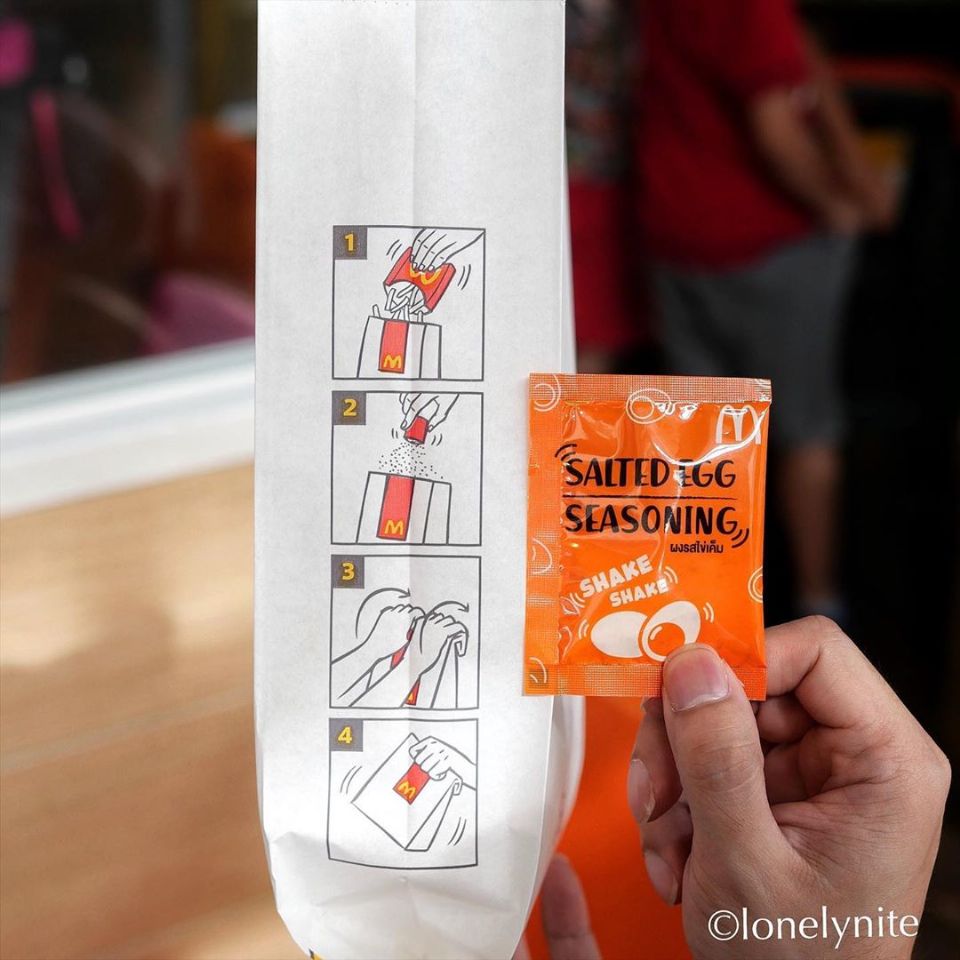 這款「鹹蛋搖搖薯條」的吃法跟台灣的搖搖薯條一樣,把剛炸好的薯條倒進「Shake Fries」袋子裡,在加入鹹蛋黃粉,接著把這袋大力搖晃均勻後,就可以吃到美味的「鹹蛋搖搖薯條」啦!