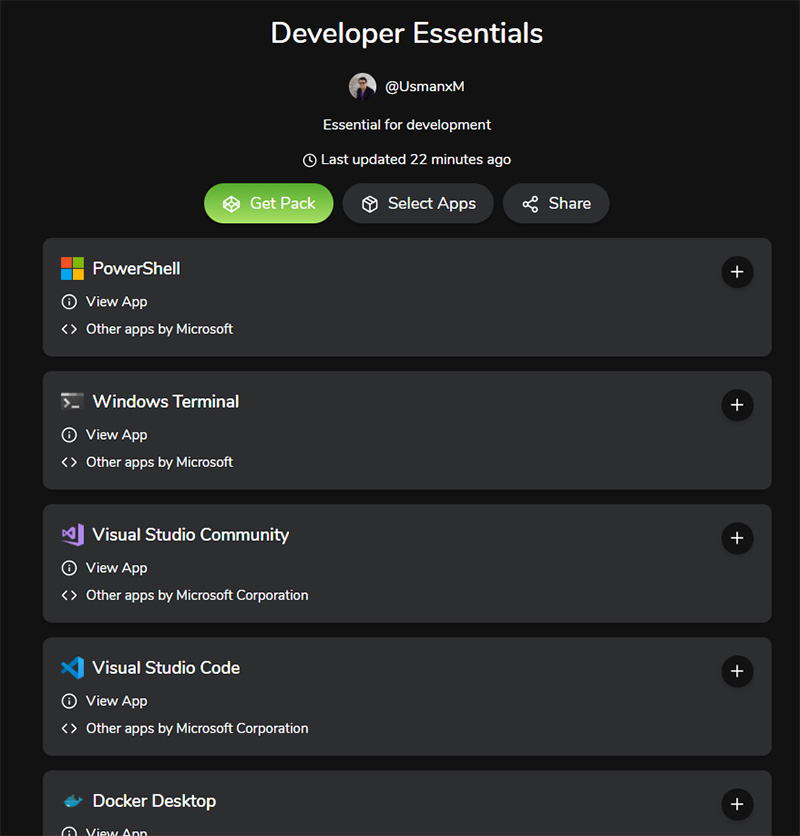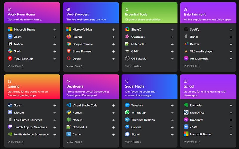 Winstall 非常適合定期會更換電腦,或是經常會需要格式化重灌的 Windows 用戶,另外對於有頻繁裝機需要的電腦工程師也很實用。你可以從 網站上創建與共享依照自己需要打造的應用程式列表,並將其自定為一個軟體包的組合,例如對於玩家來說可能會想把一整套遊戲平台像是 Steam、Discord、Twitch、Origin、Uplay 等打包在一起,又或是一系列包含 Zoom、Slack 和 Microsoft Teams 的遠端會議工具等。當然你也可以用別人分享出來的組合包,隨你挑選著來。