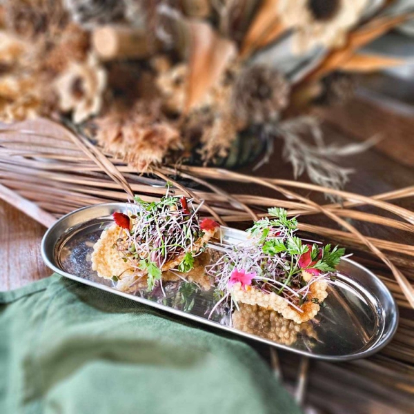 完全顛覆對泰式料理的印象!以家鄉的雲南料理融入泰北佳餚,創造出全新的風味,堅持使用當地食材,如經營者奶奶做的一樣,希望能用最純粹的食材撫慰人心,品嚐它最原始的風味,主要販售各種創意泰式蔬食料理,沙拉、高麗菜捲適合無麩質者,店內空間裝潢相當漂亮,來這用餐視覺、味覺都是一種享受。