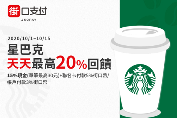 於2020/10/1~10/15,使用街口支付在「星巴克」門市付款享以下優惠: