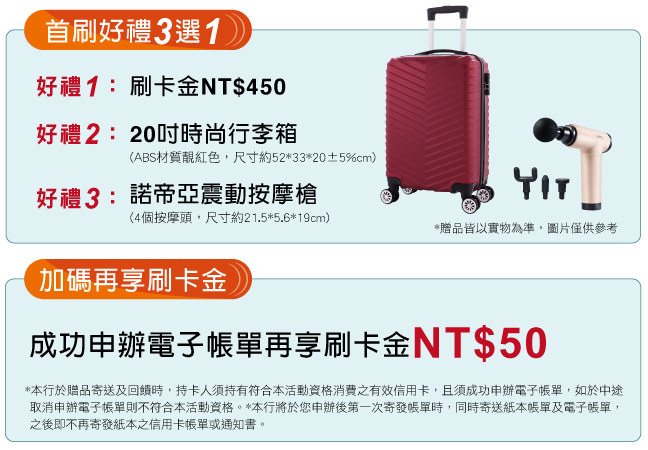 活動期間內,新戶申辦國泰世華銀行指定信用卡正卡,於核卡日後30天內刷一般消費或全聯福利中心消費,合計滿3筆且每筆888元以上,享首刷禮、加碼禮雙重回饋。