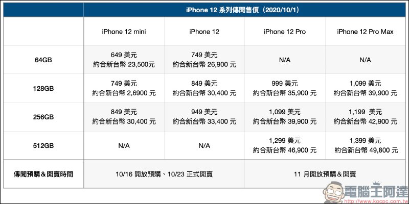 根據 Jon Prosser 的爆料,上述兩款入門的 iPhone 12 mini 和 iPhone 12 預計最快在 10 月 16 日開放預購、 10 月 23 日正式開賣,至於 iPhone 12 Pro 兩款高階機型,則是預計等到 11 月才會開放訂購(註:日期為美國時間)。