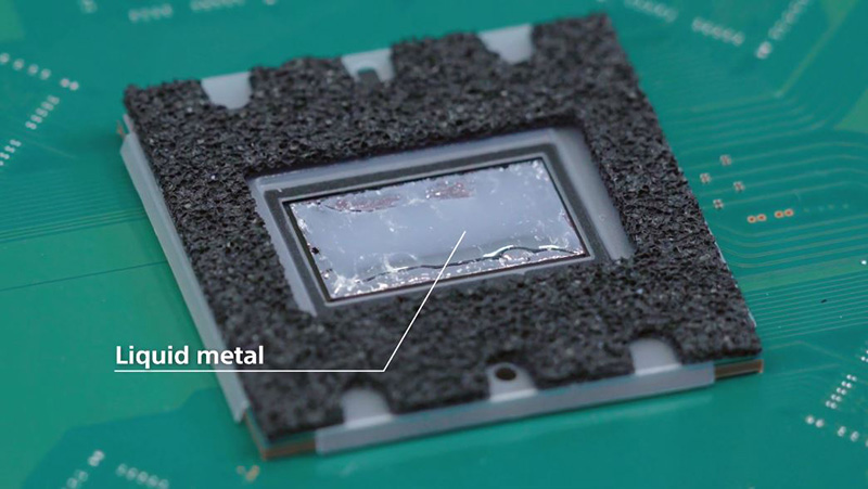 然後看到的就是重要性等同於 PS5 心臟的主機板了。在主機板上配置了 X86 的 64 位元八核心 AMD Ryzon Zen 2 處理器(最高時脈 3.5GHz)與 AMD Radeon RNDA 影像處理 GPU(最高時脈 2.23GHz)。PS5 上的 SoC 以超高時脈運行,也由於矽晶片的熱密度很高,所以必須大幅提升 SoC 與散熱導體之間的效能,在處理器背面更是以液態金屬塗佈,以增進散熱效能。