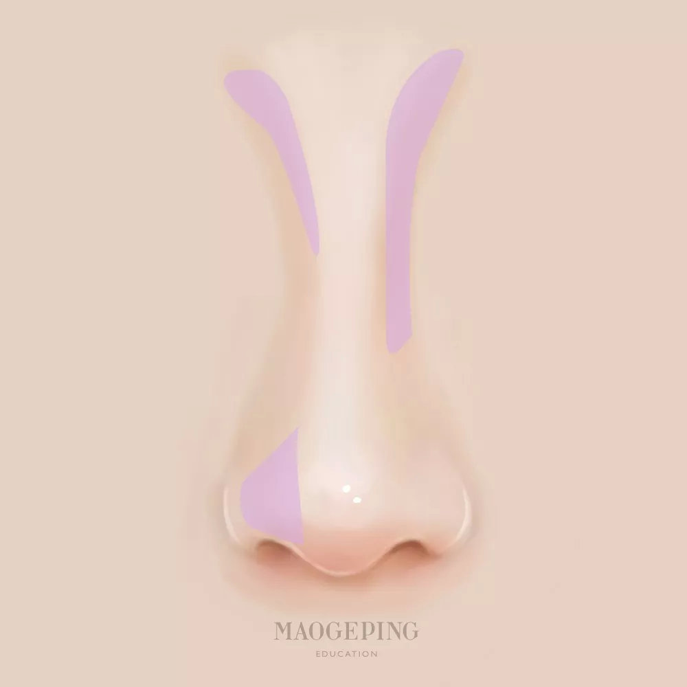 鼻樑短小會令人的視覺效果看起來像是扁臉一樣,所以只要在視覺效果中把鼻樑拉長就能夠令整體臉部變得更小。而鼻影的畫法則由鼻翼開始向眉頭方向畫,盡可能令眉頭和眼角都畫上陰影。