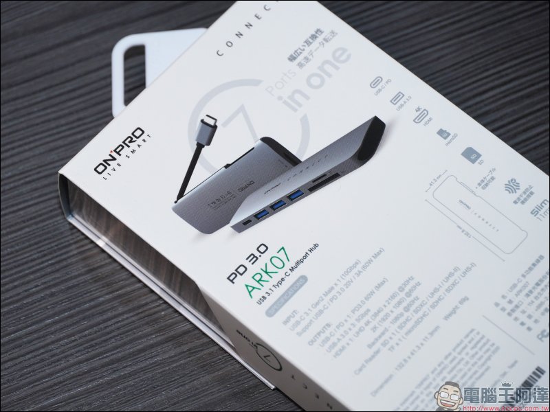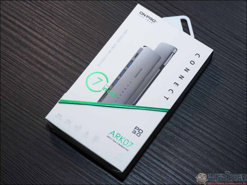 如果上述 5 合 1 的 ARK05 的連接擴充數量沒法滿足各位的需求,尤其是有更多對於 USB-A 同時連接的需要、希望能將 USB-C 連接線在平時收納能隱藏,那麼具備 7 合 1 的 ARK07 就是更適合的選擇。