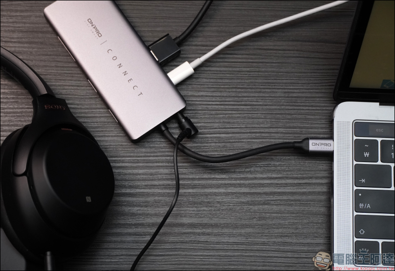 即便筆電也有 3.5mm 耳機孔,不過對於想將所有線材集中在一側讓桌面更乾淨整齊,那麼藉由 ONPRO Type-C 多功能擴充集線器 ARK11 將讓耳機插孔能放置在筆電使用就顯得相當方便: