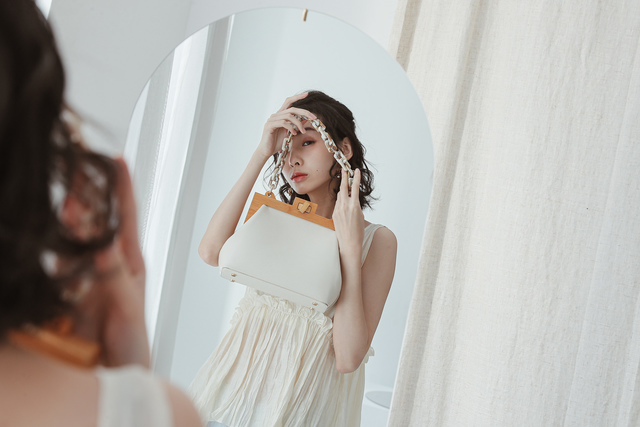 白色系的包款乍看之下不是那麼好駕馭,但多了木質材質的包口拼接讓以白色為基底色的口金包表現出平易近人的外型質感。巧妙地加上了鍊條設計作為手提把,可拆式的提帶即使在手提時自然垂墜也很好看。這款口金包透過不同元素的組合讓經典的包款也相當有特色感。
