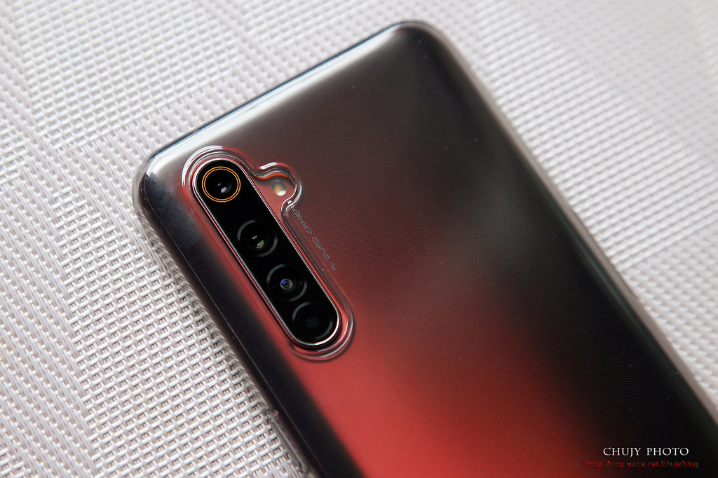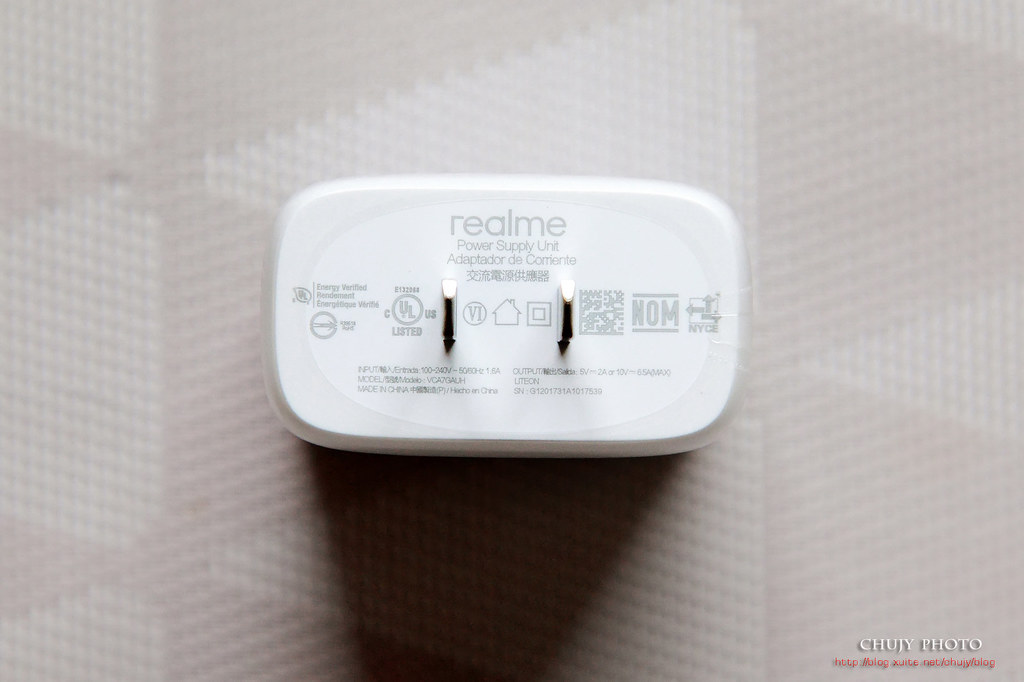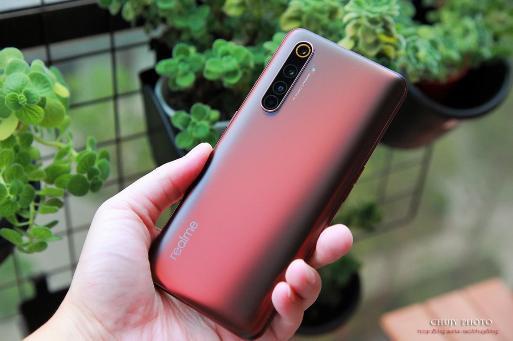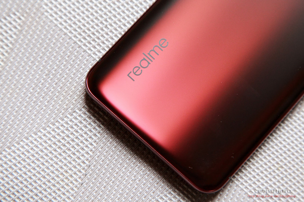 左下方有著 realme logo,搭配著圓弧的機身線條,有點美
