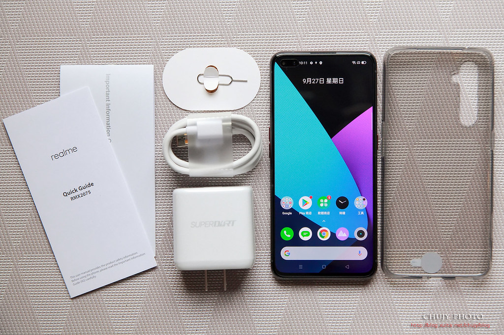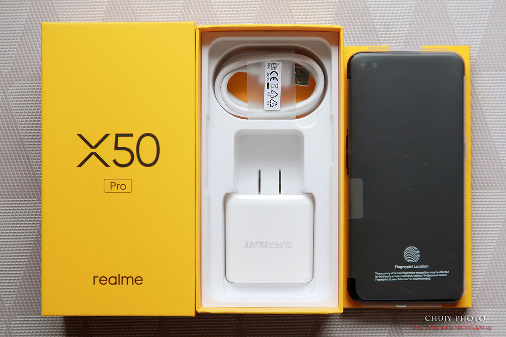 所有內容物列表:重要資訊指南(保固卡),SIM 卡針,USB Type-C傳輸線, 65W SuperDart 超級閃充充電器,realme X50 Pro手機以及保護殼。