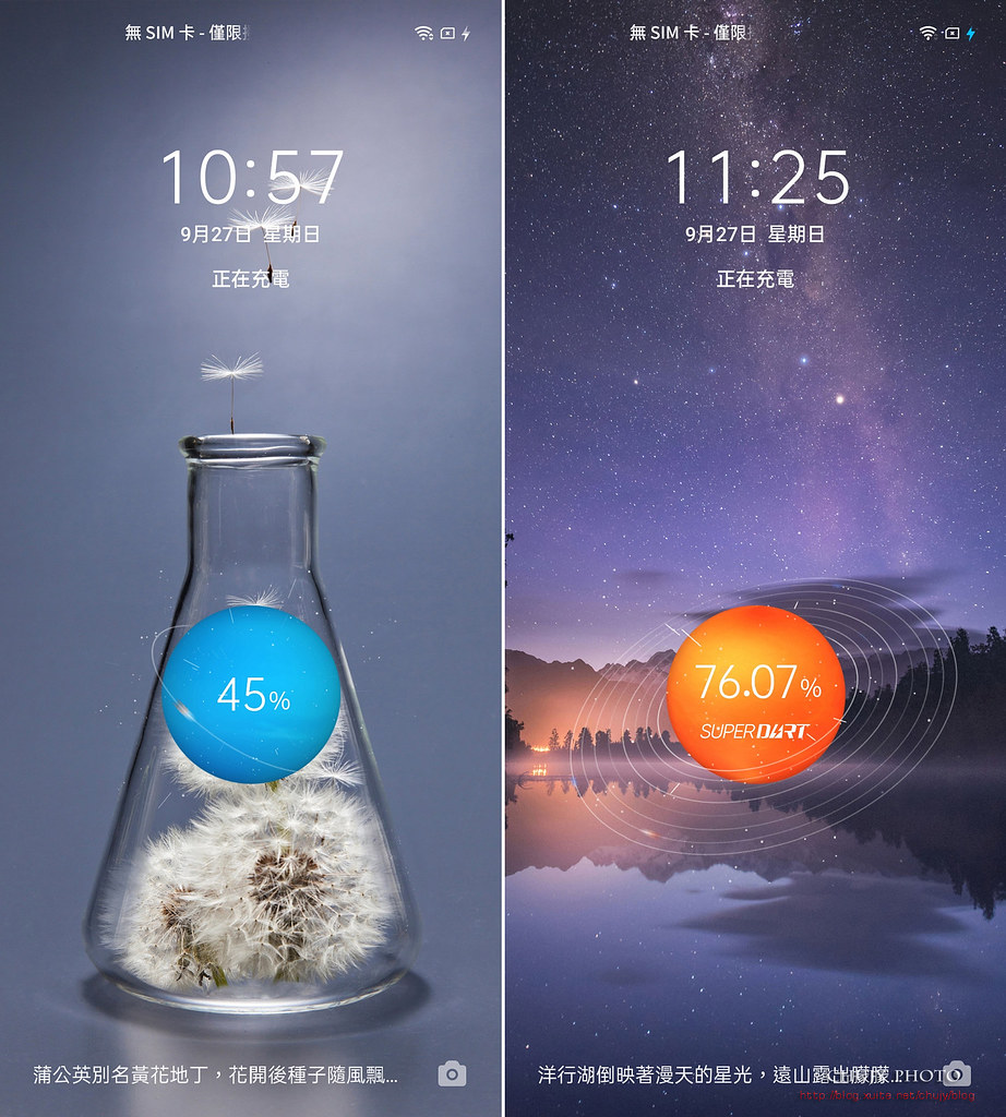 以下充電畫面,左邊為使用一般插頭時的畫面,右邊則為接上65W SuperDart 超級閃充充電器的充電畫面。