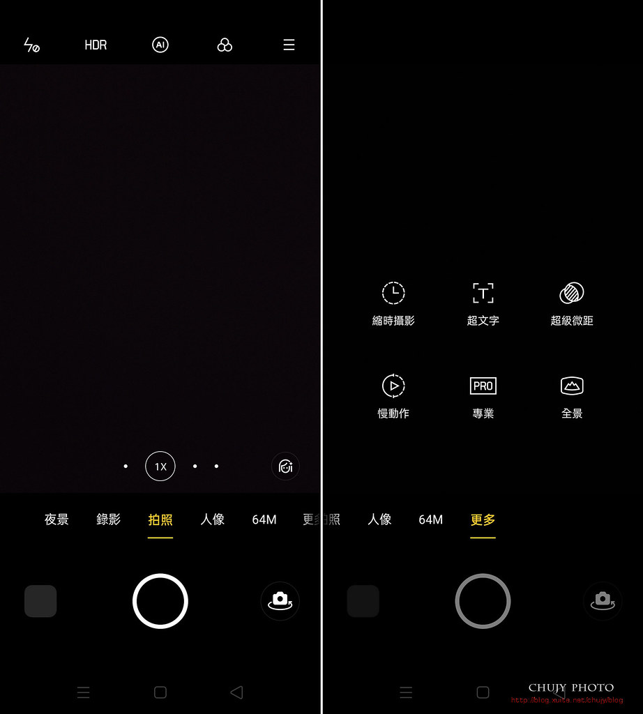 另外,也提供了肖像畸變矯正、超文字、64M 模式、極暗夜景超級夜景、全景、專業、縮時攝影、人像模式HDR、超廣角、超級微距、AI 場景辨識、AI 智慧美顏、濾鏡、炫彩 AI 模式、可調節景深效果等等,功能上應有盡有。