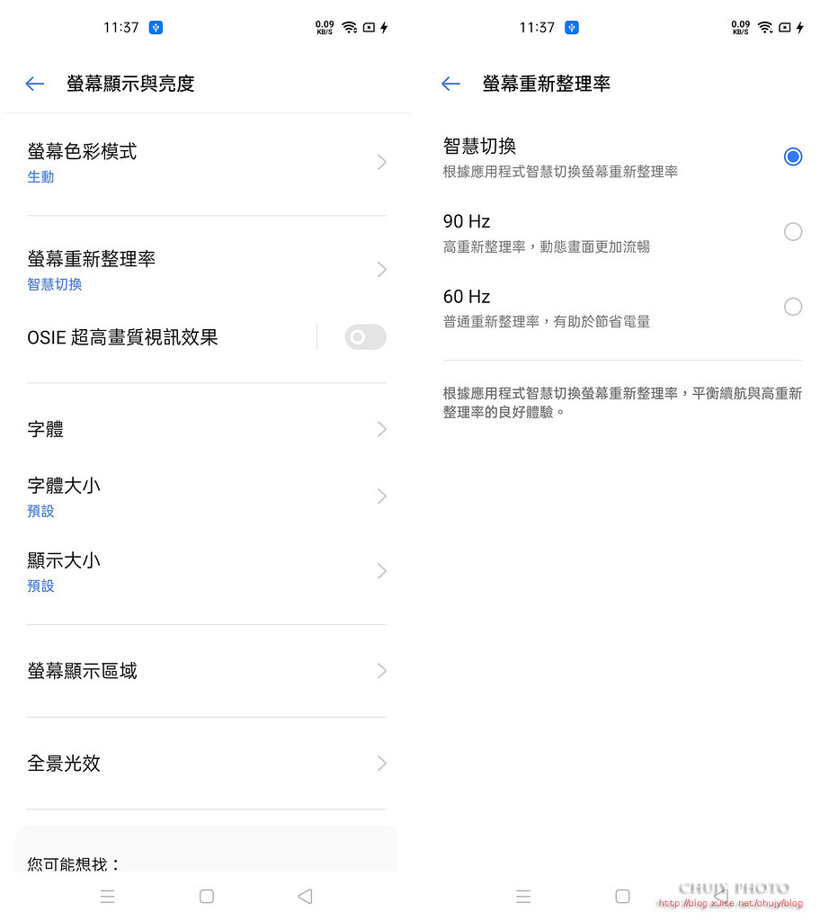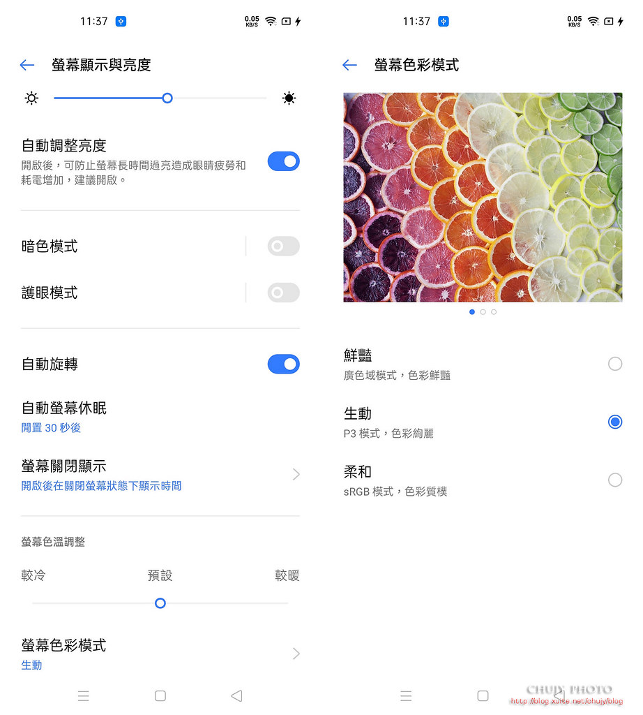 使用 Super AMOLED,支援暗色/護眼模式,另外也提供鮮豔/生動以及柔和等螢幕色彩模式。