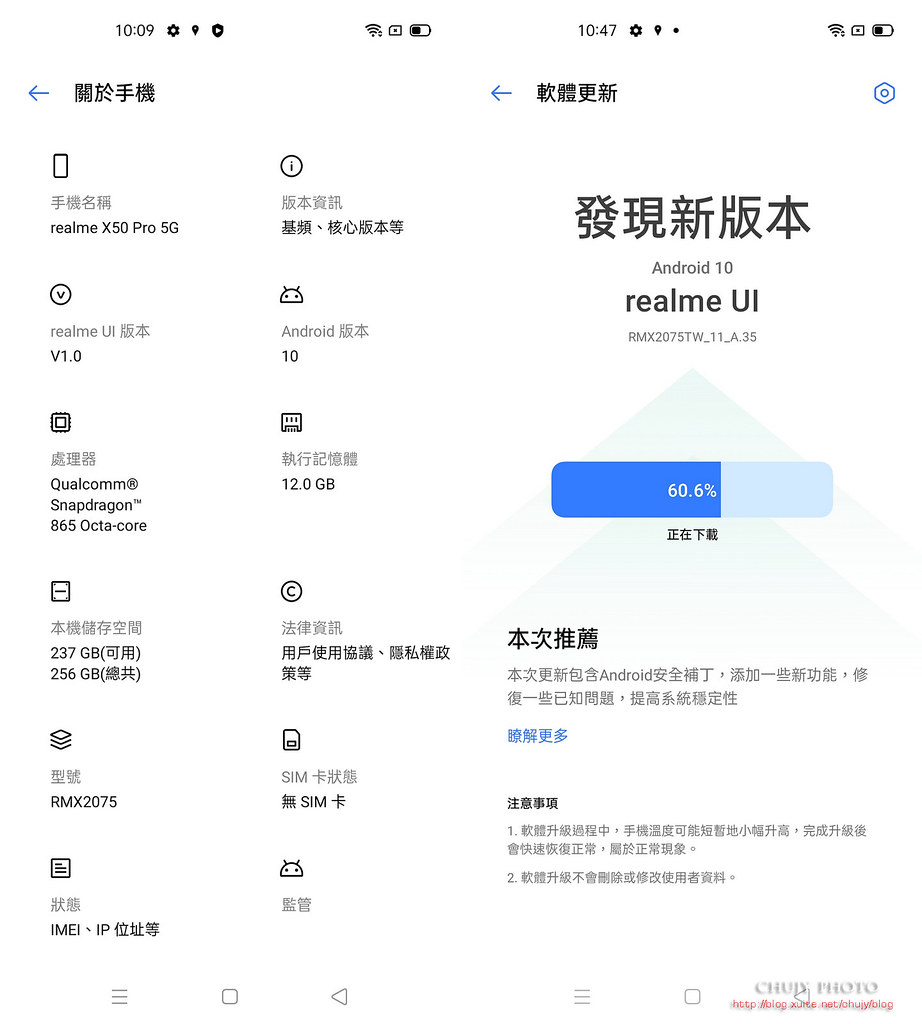 使用Android 10 的 realme UI 1.0,RAM/ROM : 12GB/256GB,剛好下載最新 realme UI更新檔。