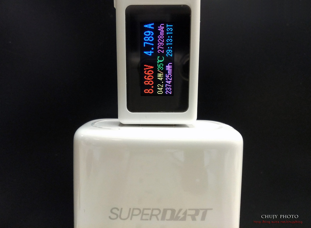 經由測試,由36%開始充飽,僅需28分鐘左右。一般來說低電量下會啟動高功率快充,隨著電池充飽的比率上升,會逐漸降低充電功率,依照42W 充電來說,大約50幾分鐘可以從 0% ~100%充飽。