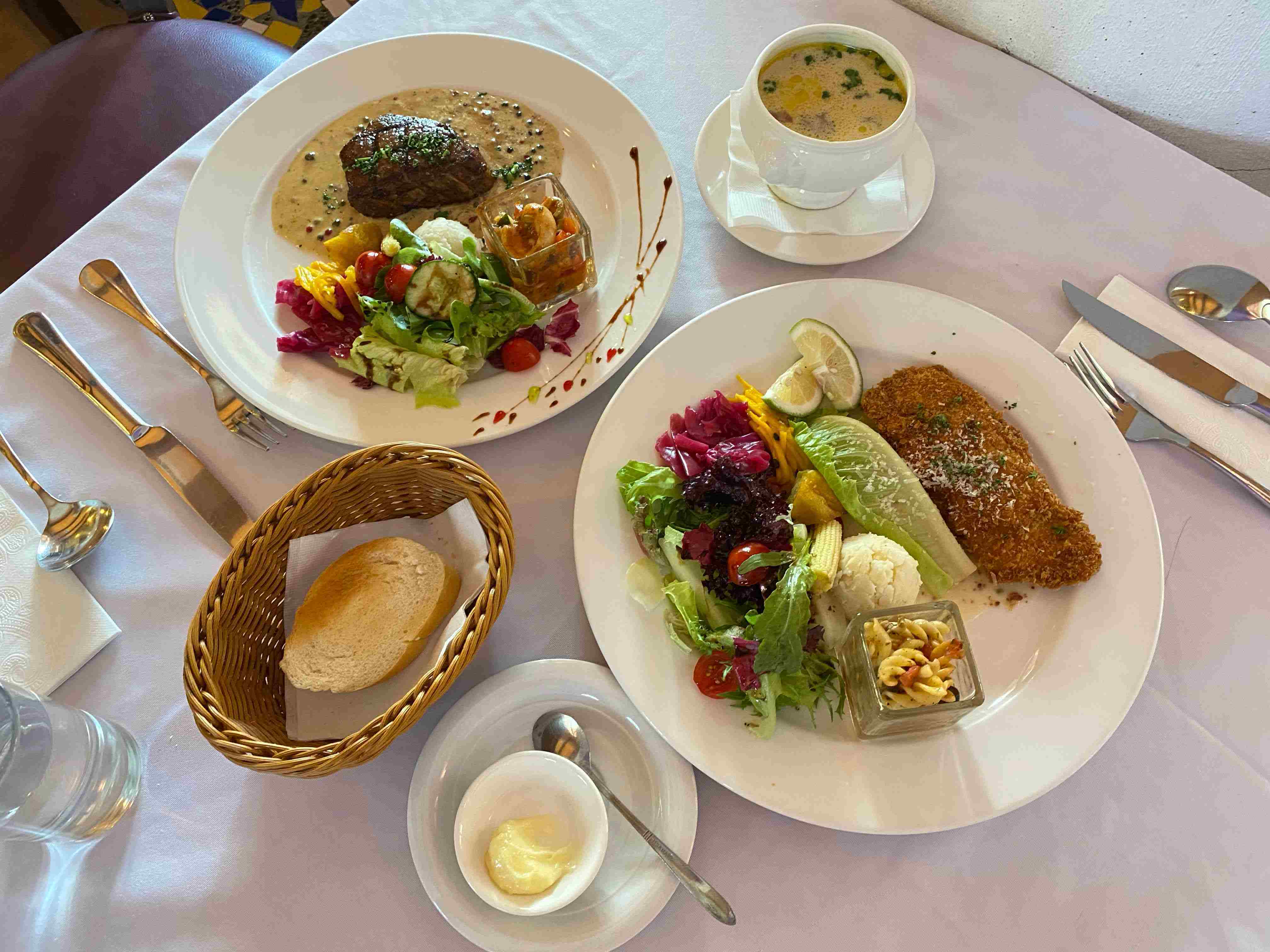 首先映入眼簾的是擁有大膽對比色圖騰的拱形長廊與石柱外牆,而整家餐廳則是帶點美式西部牛仔的氛圍,除了懷舊的民謠駐唱舞台還有木造調酒吧台。餐點的部份從羊肩、牛排、烤雞、再到義大利麵與燉飯都能看見地中海菜色的身影,即便是炎熱的夏季也很誘發食欲。