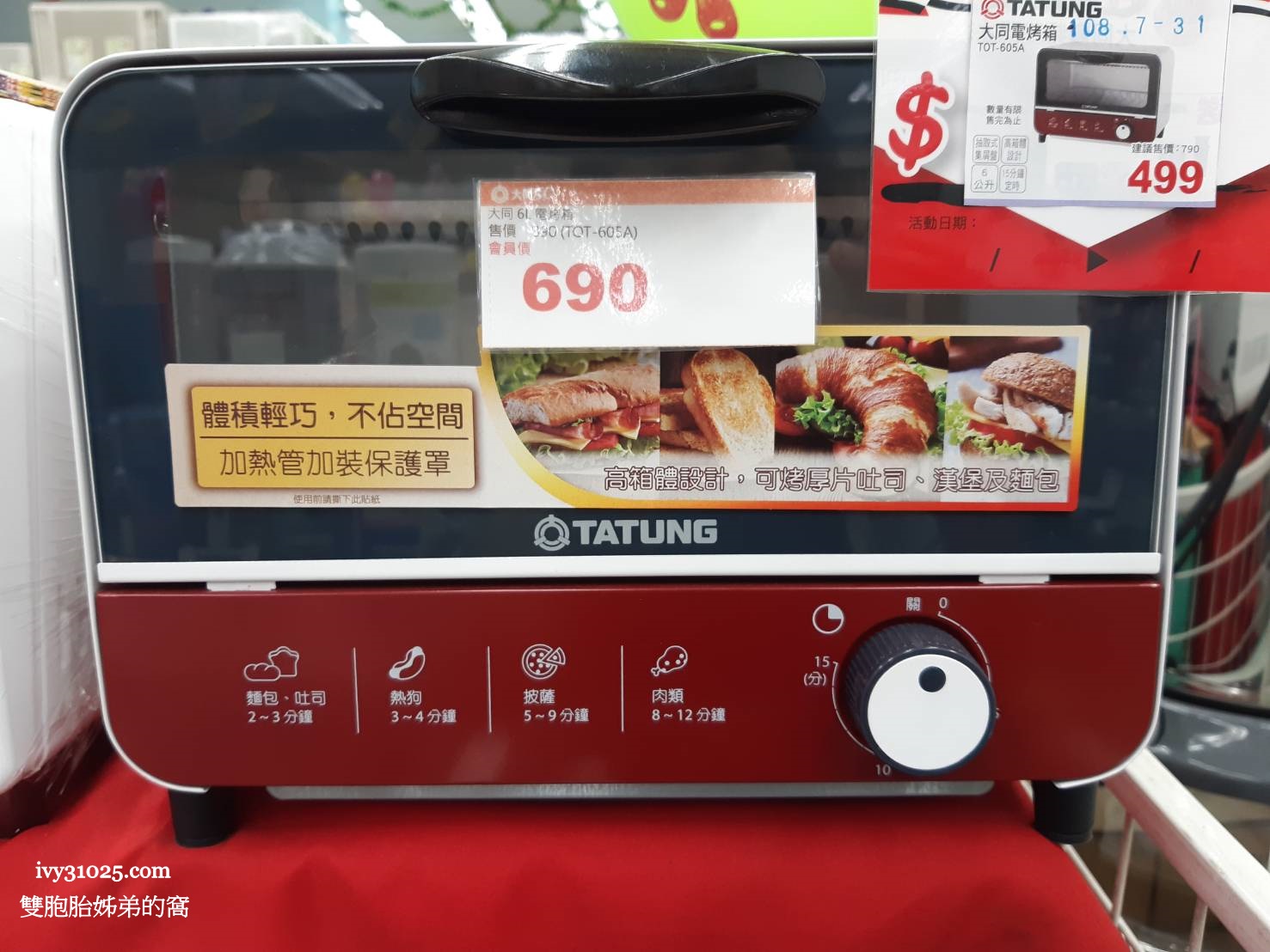 大同電烤箱 TOT 605A這一台特價699,好便宜悠~~,體積輕巧不占空間,很適合一般上班族或是外出學生使用。