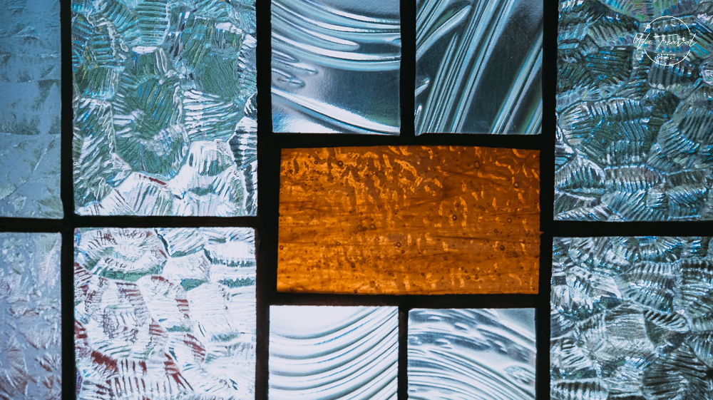 推門的玻璃用不規則的搭配,一點黃色玻璃點綴出玻璃門的特色。