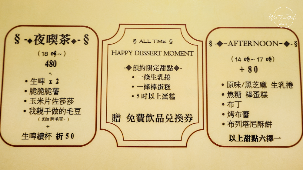 - 下午茶Afternoon(14點~17點):原味/黑芝麻生乳捲 or 焦糖磅蛋糕or布丁or烤布蕾or布列塔尼酥餅,以上甜點六選一只需要加價80元