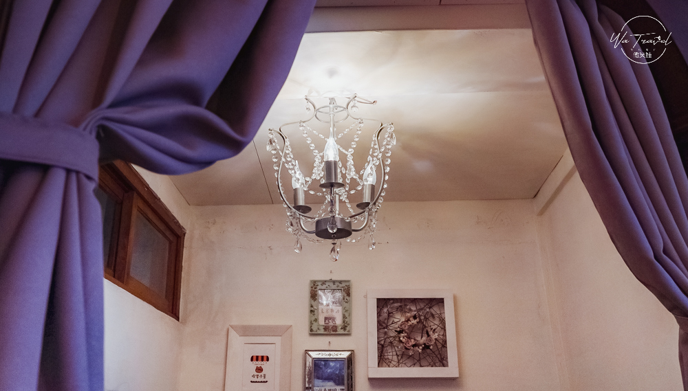 從VIP包廂往上探,水晶玻璃吊燈跟厚重的紫色窗簾增加了小包廂的奢華感。