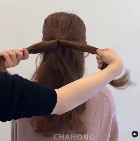 以左手食指在綁起的公主頭上半部抓出空隙,並用右手取的髮絲塞進空隙後拉出一小節,另一側重複動作編髮。