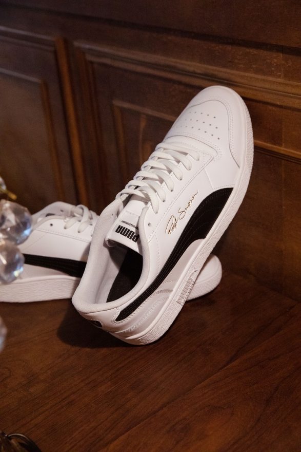 擁有傳奇背景的 PUMA Ralph Sampson 以全白皮革包覆打造高端質感,鞋側車縫上黑色皮革 PUMA 招牌彎刀並鑲上金色 Ralph Sampson 簽名字樣,鞋頭則保有籃球鞋的懷舊網眼設計,為精品小白鞋的極簡內涵注入運動潮元素。E.SO 瘦子此次以獨具的時尚品味演繹 PUMA Ralph Sampson 高段潮穿搭,率性套上 PUMA T7 連帽 T 恤展現運動新型格,用最純粹的黑白配色打造 PUMA Ralph Sampson 復古經典的內斂底蘊。