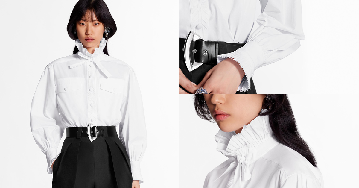 可不要誤會白襯衫就只能是中規中矩的上班族款,它也能展現如Louis Vuitton這件設計出眾的寬鬆剪裁襯衫一樣,以柔軟的純棉府綢製成,荷葉邊的領口和袖口打造出別於利落感的浪漫氣息,靈感取自紐約建築物外牆的刺繡鈕襟飾、胸前口袋和覆面鈕扣等細節,則為這件剛柔並濟的白襯衫增添無比魅力。