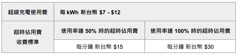 依照目前官方公佈的收費表,台特內湖、台灣大學與台中 Jmall 分別有尖峰(週一至週五 07:30-22:30)以每分鐘 9.8~9.6元不等收費,與離峰(尖峰以外時間)7.8~7.6元的分別,其他各地除了花博、苗栗、勤美與奇美等四處收費超過9元以外,普遍在7~8元左右,另外採以「度」(kWh)計費,不足一度不計費(無條件捨去法),在導航電腦上都會標註該超充站當前的收費資訊與可用充電車位數量: