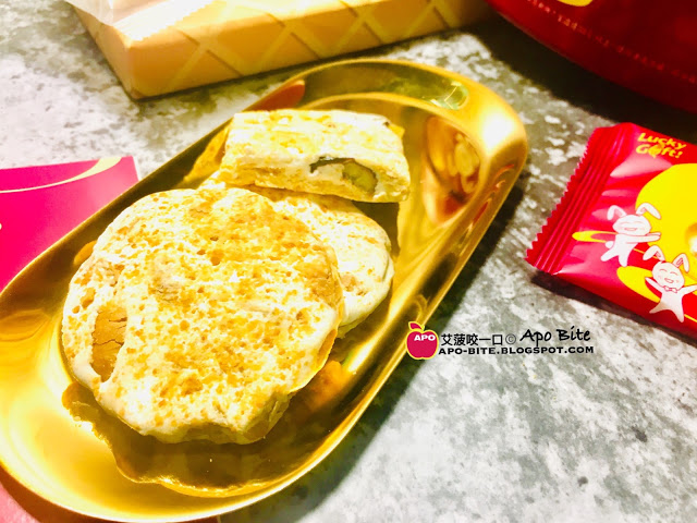 外觀方形的幸福糖內餡還包裹著蔓越果乾、酥餅、開心果