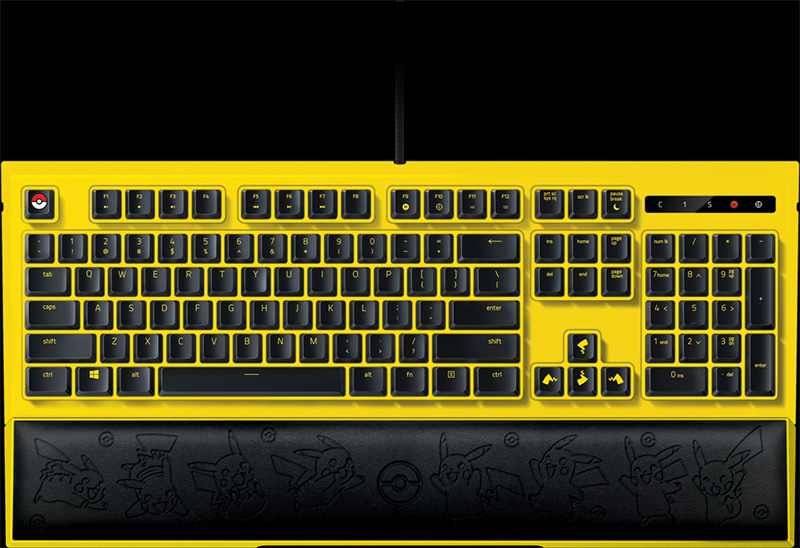 以 Razer Ornata 機械薄膜鍵盤為基底,搭配經典皮卡丘亮黃色特殊塗裝,在 ESC 鍵帽部分改以精靈球圖案替代,而方向鍵則是皮卡丘尾巴來做為上下左右的指示。為了減少長時間使用所帶來的疲勞,這款鍵盤隨附一個可依需要拆卸與安裝的人體工學設計護腕墊,可大幅提升舒適度和支撐度,上面更是稍稍低調的讓皮卡丘盡情活躍其上,以可愛為你的戰力護持。