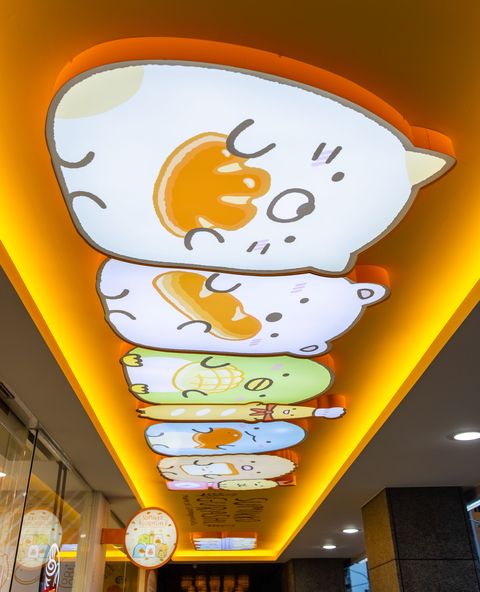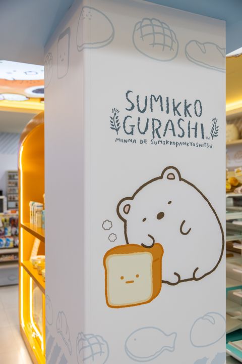 店內天花板設計則使用『角落小夥伴-烘培教室主題』之經典角色跟麵包的造型燈片,整家店從內到外甚至連ATM提款機都大量使用角落小夥伴的主題圖素!