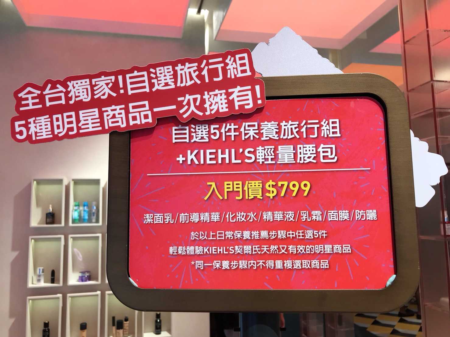 深得年輕妞妞喜愛的Kiehl’s也在這裡販售全台獨家自選旅行組,可以自己挑潔面乳、前導精華、化妝水、精華液、面膜、乳霜、防曬,任選5件加上輕量腰包,799元就能入手!