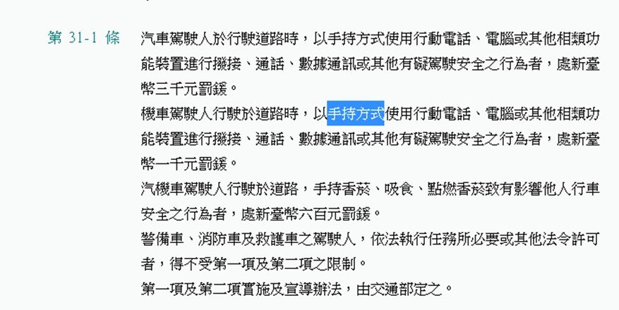 根據《道路交通管理處罰條例31-1》規定,「機車駕駛人行駛於道路時,以手持方式使用行動電話、電腦或其他相類功能裝置進行撥接、通話、數據通訊或其他有礙駕駛安全之行為者,處新台幣1000元罰鍰」,汽車駕駛人則處3000元罰緩。