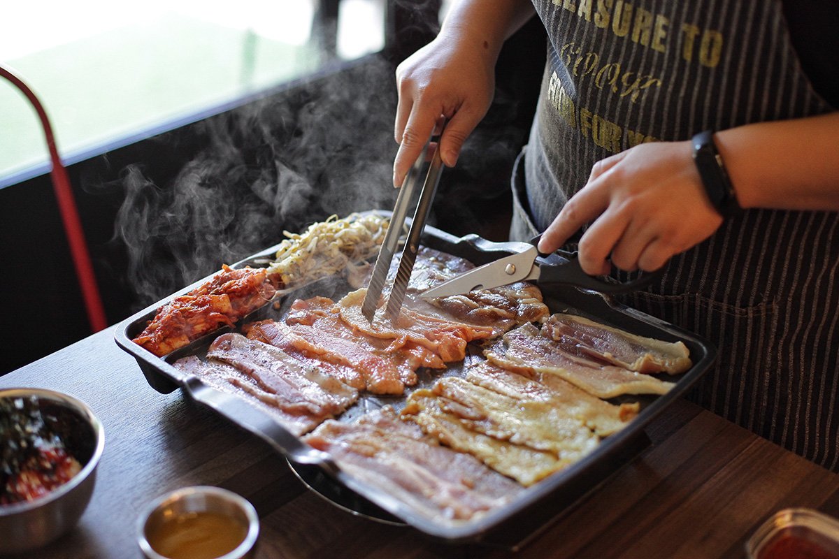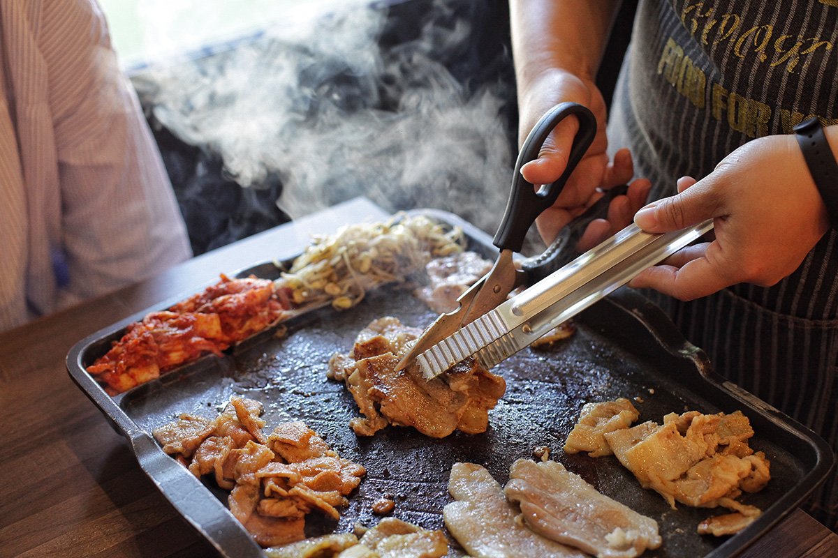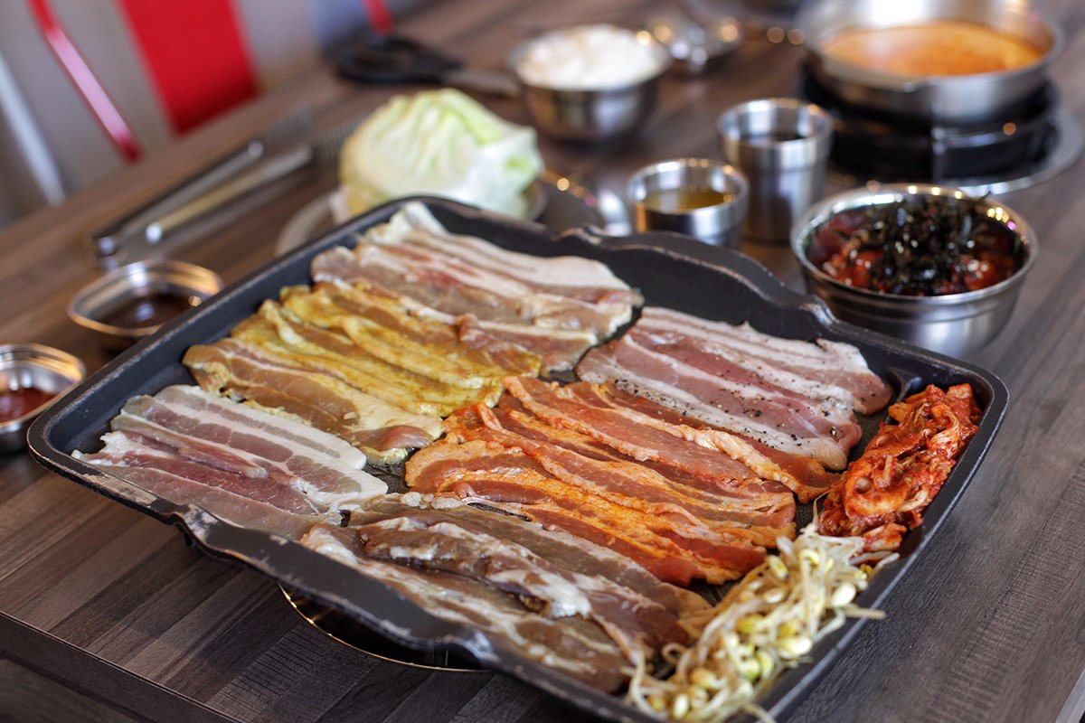 「肉多多雙人套餐」可說是這家店的必點招牌,光是五花肉盤盛上就已經令人大飽眼福,韓國大醬、醬燒、南洋咖哩、辣味、蒜味、黑胡椒......6款不同口味的肉片在烤盤上焦滋作響,老闆偶爾也會桌邊服務地替客人烤肉,將五花肉來回翻面、剪塊,一氣呵成的動作也讓人迫不及待地想趕緊開動。