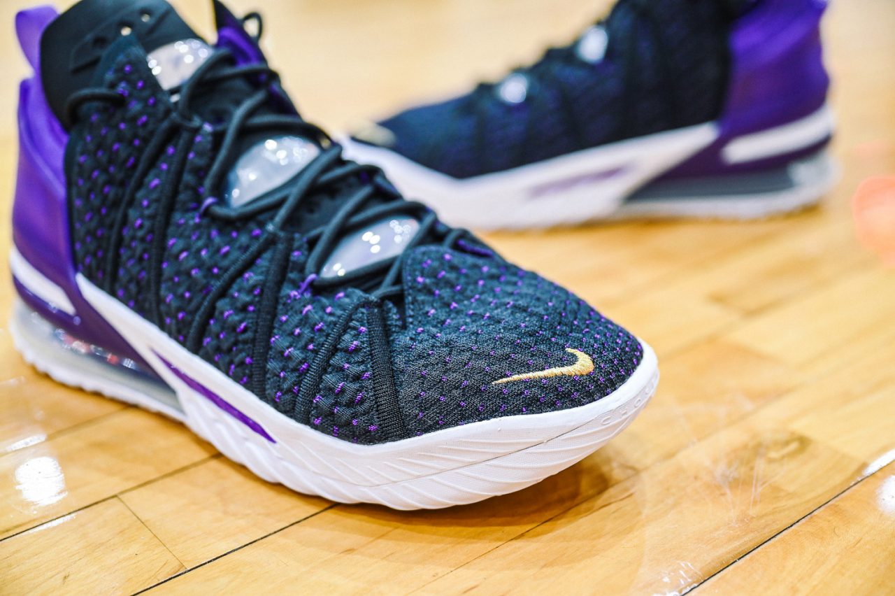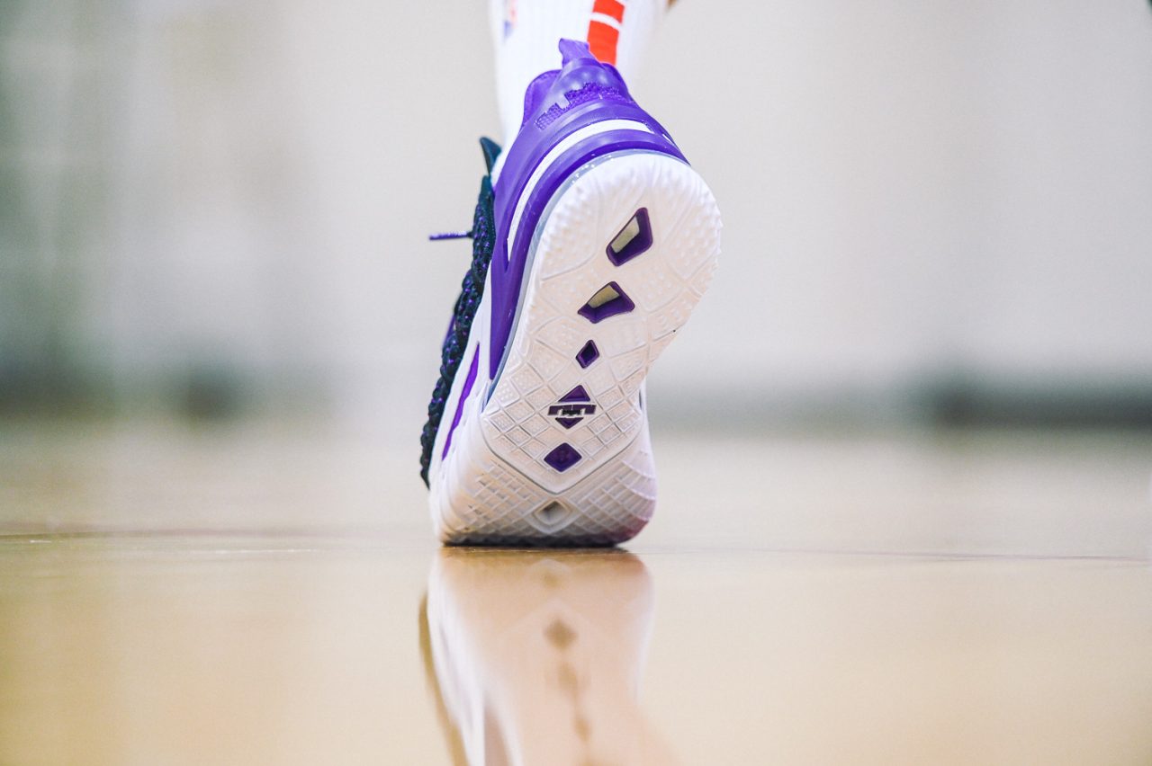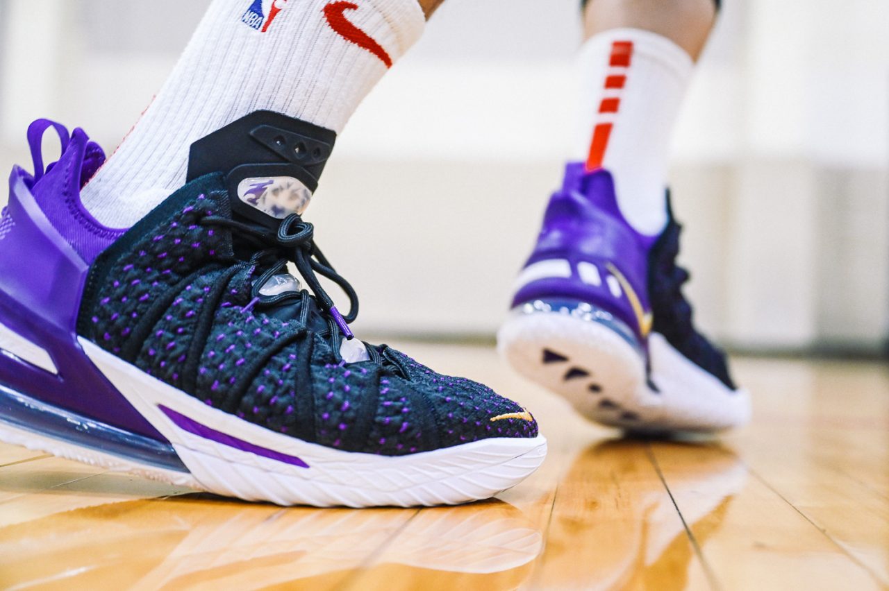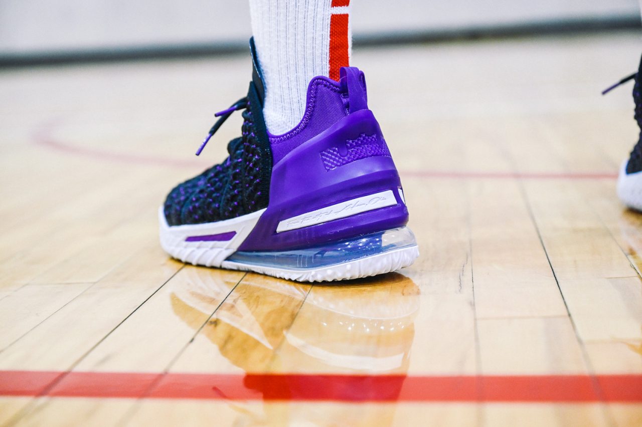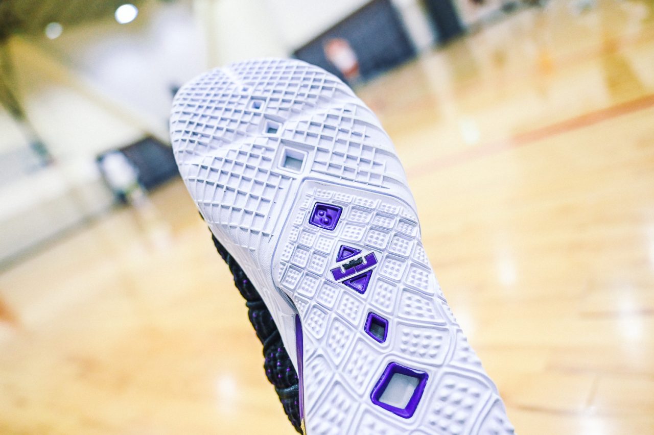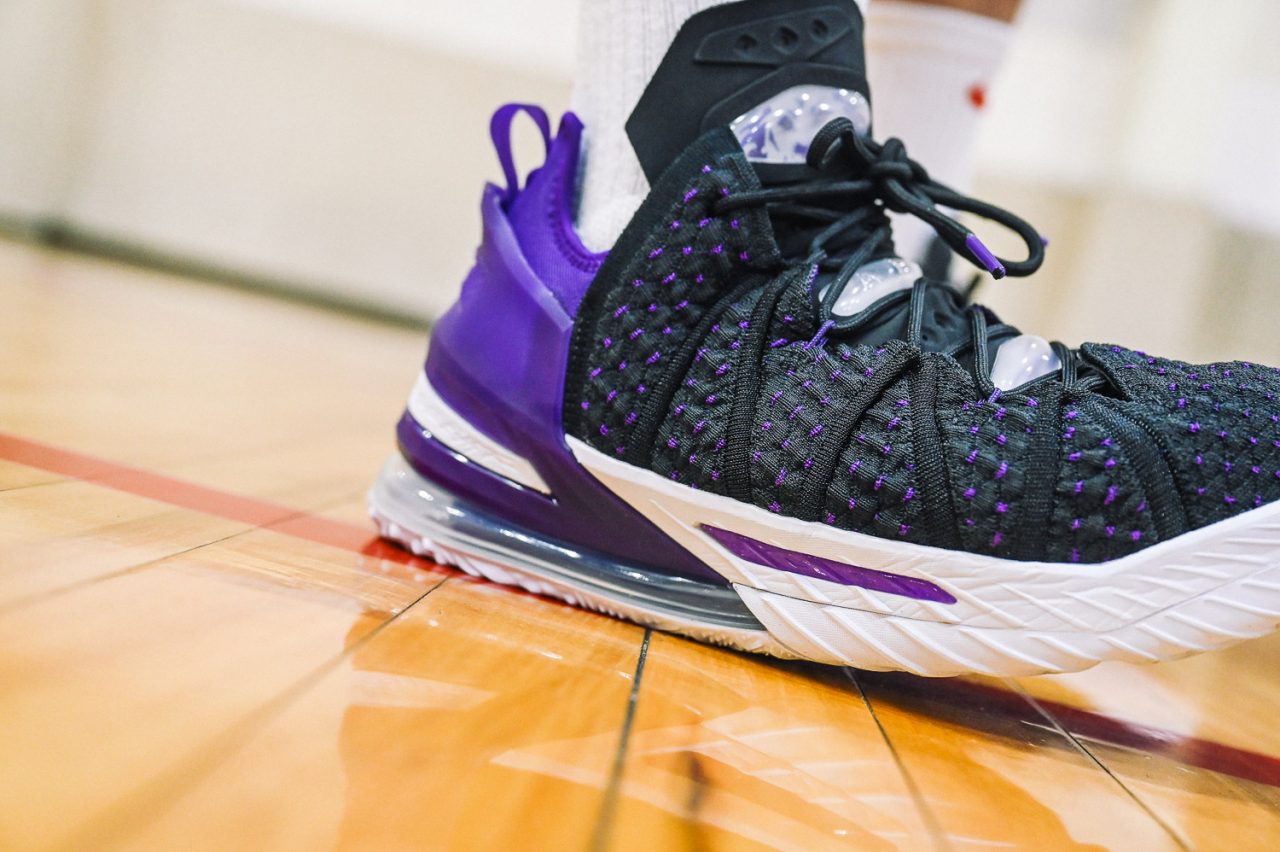 這回實穿的是 LEBRON 18 “Home” 主場配色,低調的黑紫配色,不禁讓人想起經典 Air Max BW 的基本配色。而鞋身色塊分成前鞋身黑色的BattleKnit 3.0,與後方 TPU 包覆腳踝部分的紫色區域,在設計上也是有著 Speed/Power 兩種模式兼具的意味,畢竟全能的 LEBRON 系列鞋款,在速度與力量爆發上,都是無與倫比的,要能夠作為 LeBron James 的信心後盾,要兩者兼具絕對是鞋款的首要訴求。