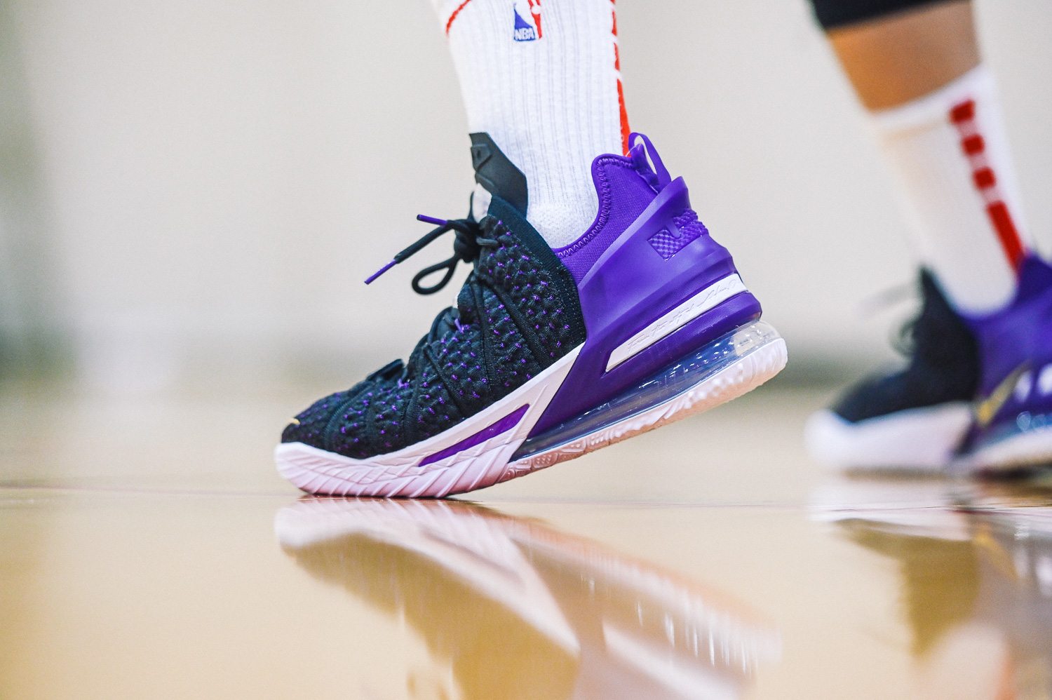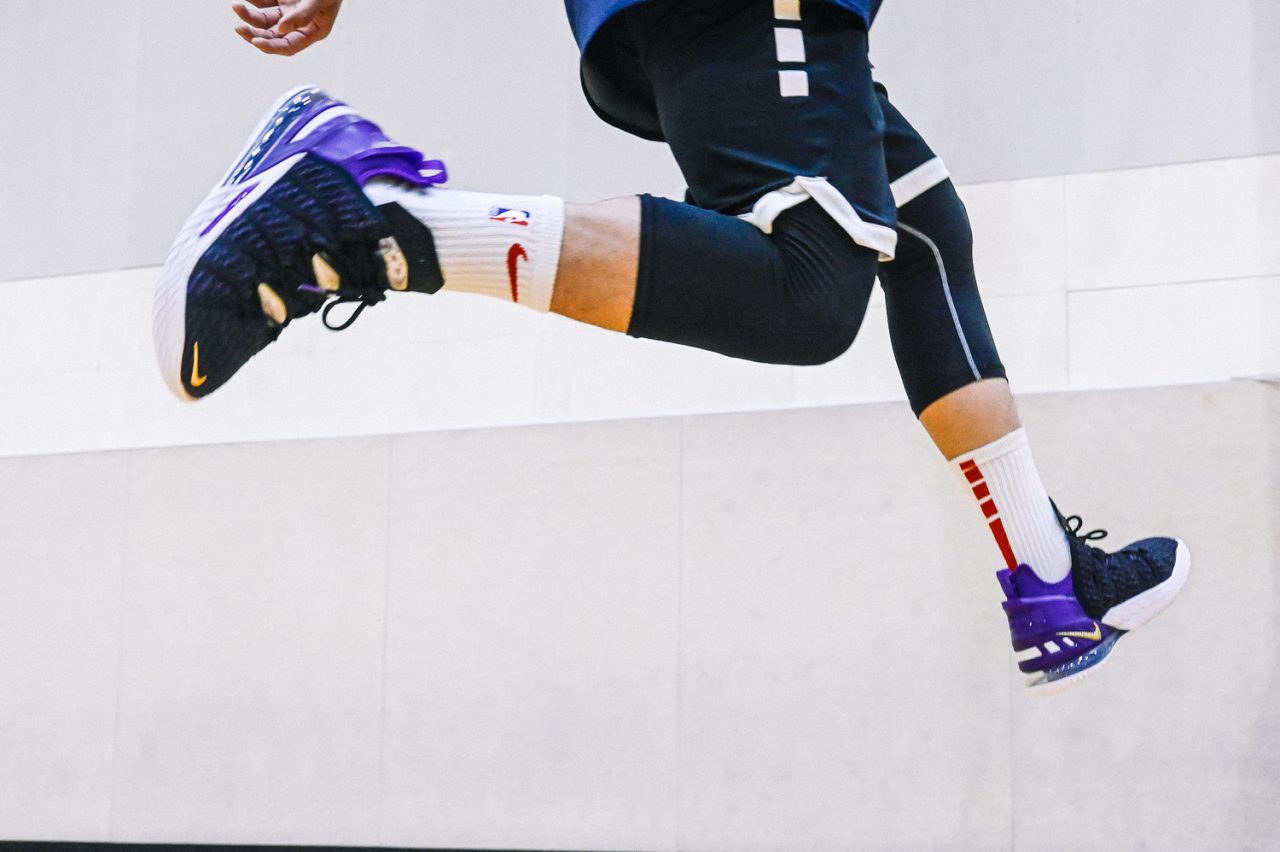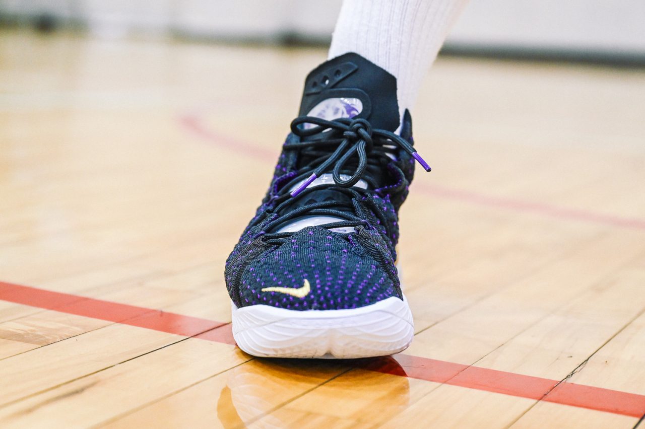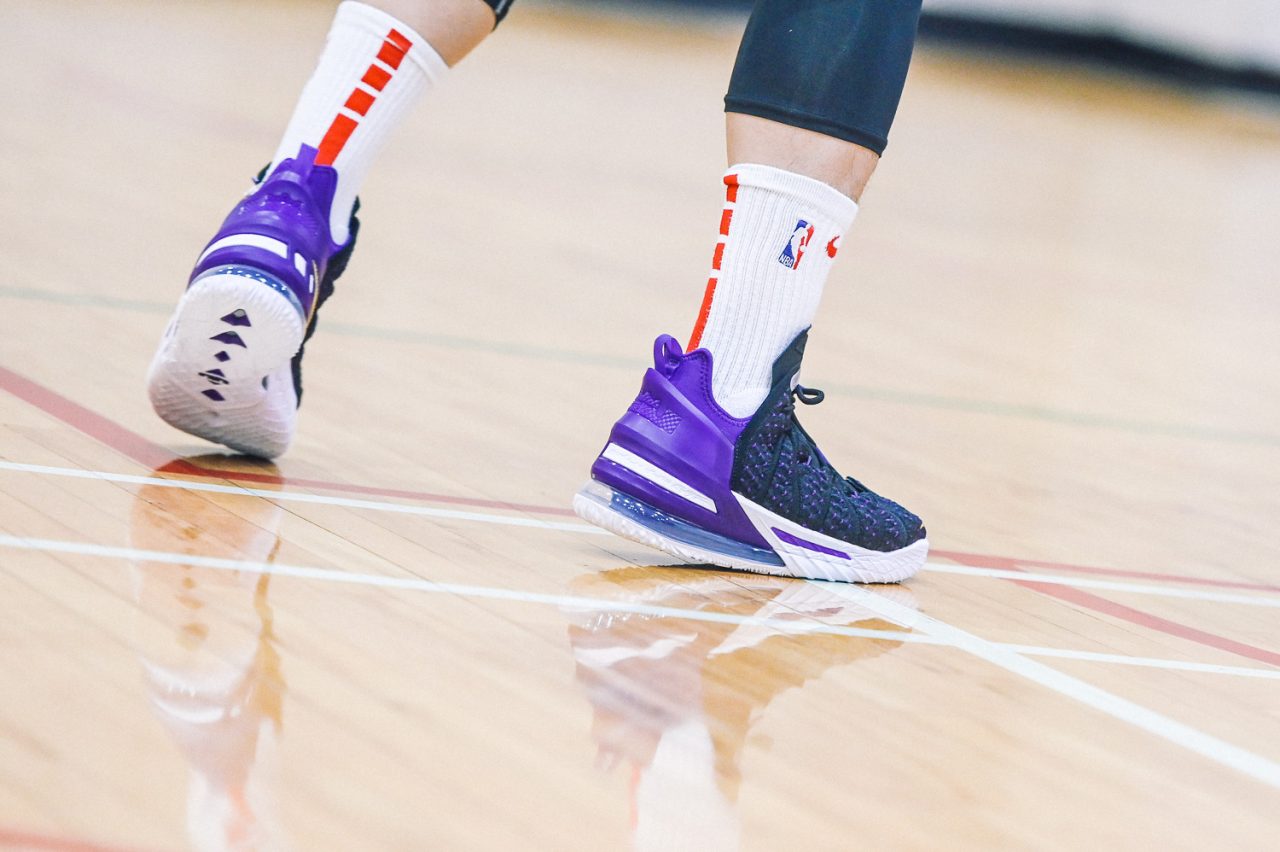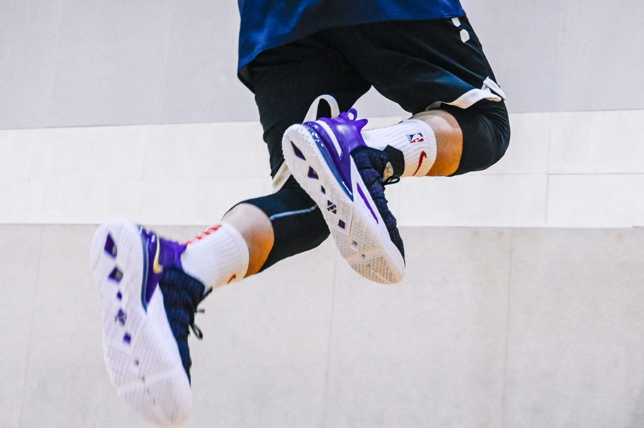 這回實穿的是 LEBRON 18 “Home” 主場配色,低調的黑紫配色,不禁讓人想起經典 Air Max BW 的基本配色。而鞋身色塊分成前鞋身黑色的BattleKnit 3.0,與後方 TPU 包覆腳踝部分的紫色區域,在設計上也是有著 Speed/Power 兩種模式兼具的意味,畢竟全能的 LEBRON 系列鞋款,在速度與力量爆發上,都是無與倫比的,要能夠作為 LeBron James 的信心後盾,要兩者兼具絕對是鞋款的首要訴求。