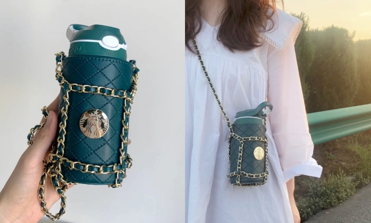 這麼有誠意的杯套應該是第一次看到吧?金色鍊條加上墨綠色菱格,皮質杯套真的太讓人懷疑是精品的啦!背在身上整個超時尚有夠加分,聽說在中國已經造成一波搶購熱潮了呢!
