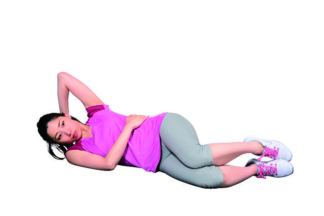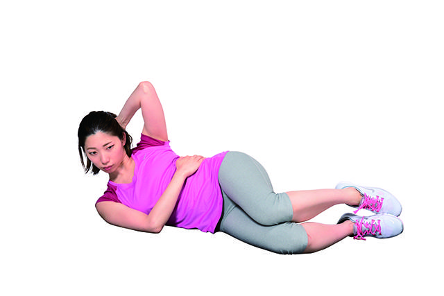 ①側躺屈膝,上側的手擺在後腦勺或是耳後一帶,接著伸直背脊,將下側的手擺在腹側。
