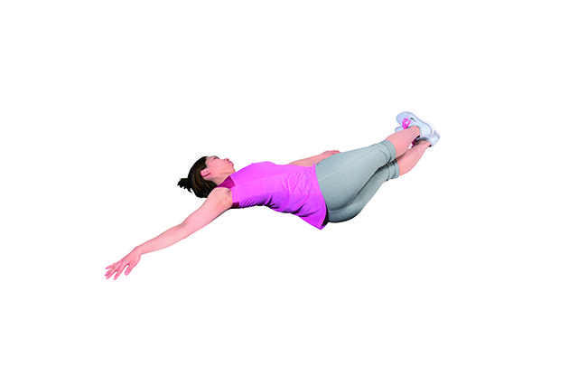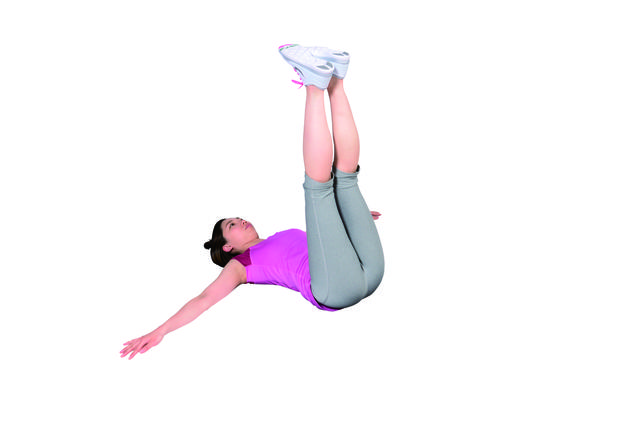 ①仰躺後雙腿併攏,接著抬腿與地面垂直。手臂朝左右張開,以維持上半身穩定,避免傾斜。
