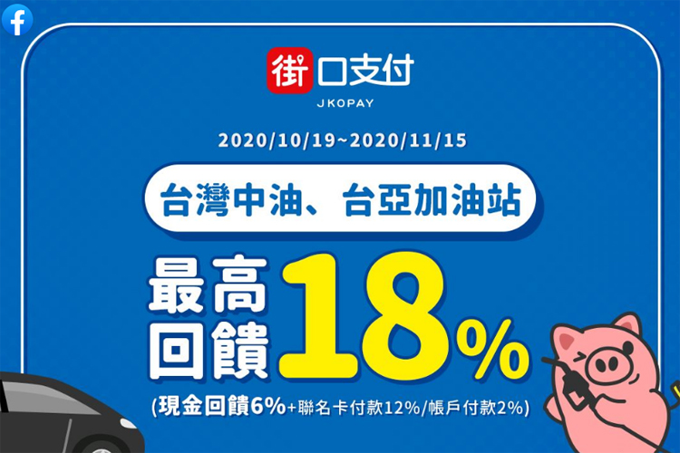 3.2020/10/1~2020/12/31 使用「街口聯名卡」綁定街口+APP於全台「台灣中油」或「台亞加油站」適用站點消費,筆筆消費可享最高 12% 街口幣回饋