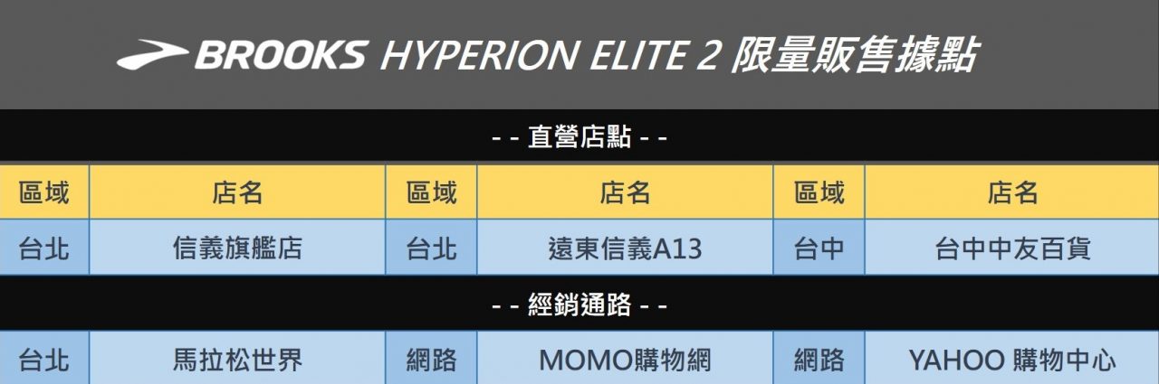 BROOKS HYPERION ELITE 2 系列已在 BROOKS 門市、限量授權經銷點發售,店點如下表,鞋款定價 8,890 元,中性尺碼,售完為止。更多跑鞋資訊請關注 BROOKS 官方粉絲團、BROOKS 官方網站。