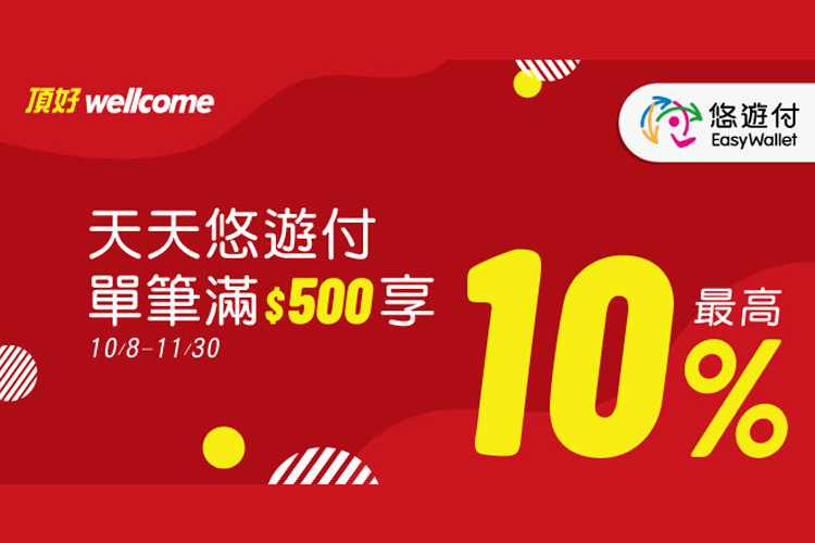 活動期間內,天天使用悠遊付於頂好/JASONS單筆消費滿500元回饋50元悠遊付儲值金,限量1萬份,每帳戶單日限贈一次,活動期間每帳戶最高回饋300元,送完為止。