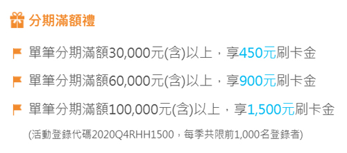 活動期間內,持花旗銀行信用卡至IKEA、床的世界、優渥實木、隆美窗簾、歐德傢俱消費,完成活動登錄,並單筆分期消費達以下門檻,享刷卡金回饋。