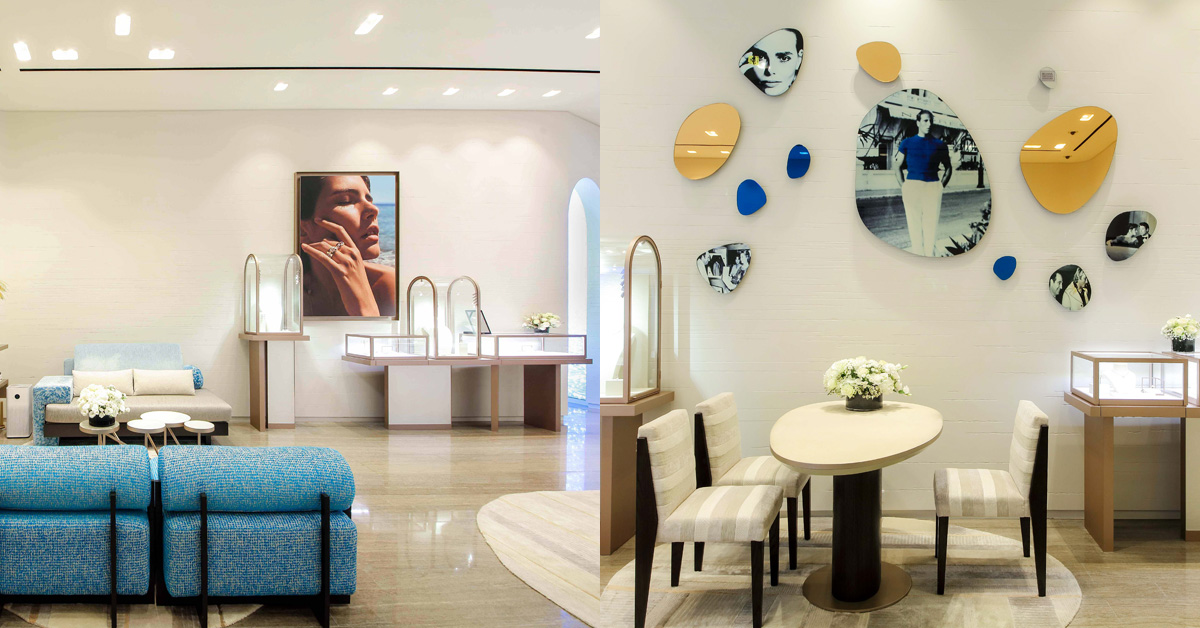 位於台北101的專賣店,延續Fred巴黎總部概念,以淡雅的金色為主調,襯托著店內閃耀、飽滿又多彩的各色珠寶作品,牆上幾處也展示了創辦人Fred Samuel先生與家族的創業歷程影像、形象廣告,透過畫面串連了品牌80多年以來的歷史軌跡,華美、高雅的現代質感。