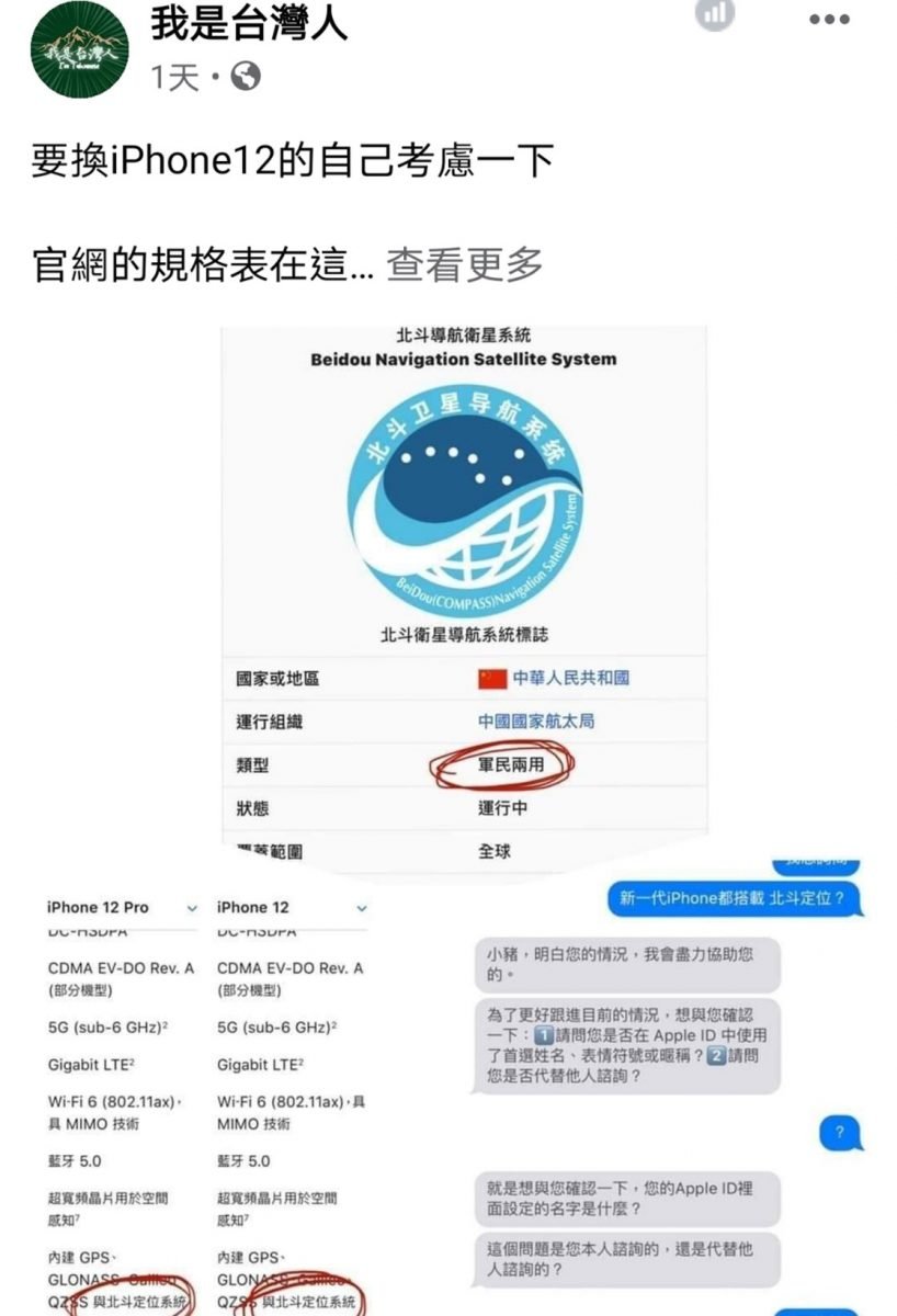 為提供更精準的定位服務並服務中國用戶需求,APPLE 在剛推出的iPhone 12系列支援A-GPS, GPS、GLONASS、Galileo 、QZSS、北斗衛星功能,其中Galileo 、QZSS及北斗衛星三個衛星定位是iPhone機型首次新增的定位系統。由於北斗衛星系統是中國獨立發展出來的軍民兩用衛星定位系統,加上相較美國GPS系統只支援單向訊號傳遞,北斗衛星系統可支援雙向溝通功能,讓知名【我是台灣人】在其粉絲頁提醒想換iPhone12的人要三思!!??