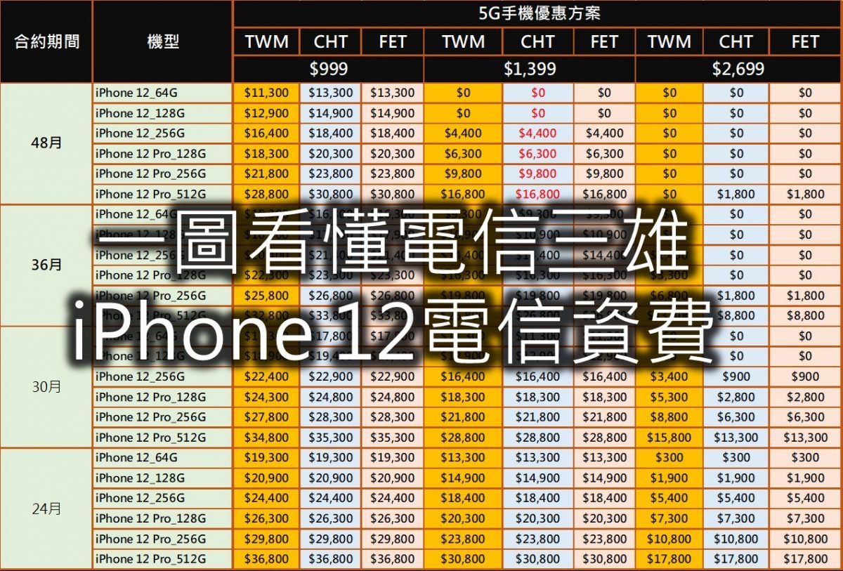 因應台灣5G標金飆出天價,電信三雄針對iPhone12的電信購機補貼策略並未採取加種補貼,而是延長綁約期限到48個月,達到iPhone12 128GB 申辦1399資費就可以$0帶回家! 該為了$0 iPhone 12,申辦48期嗎? 以下提出版主看法: