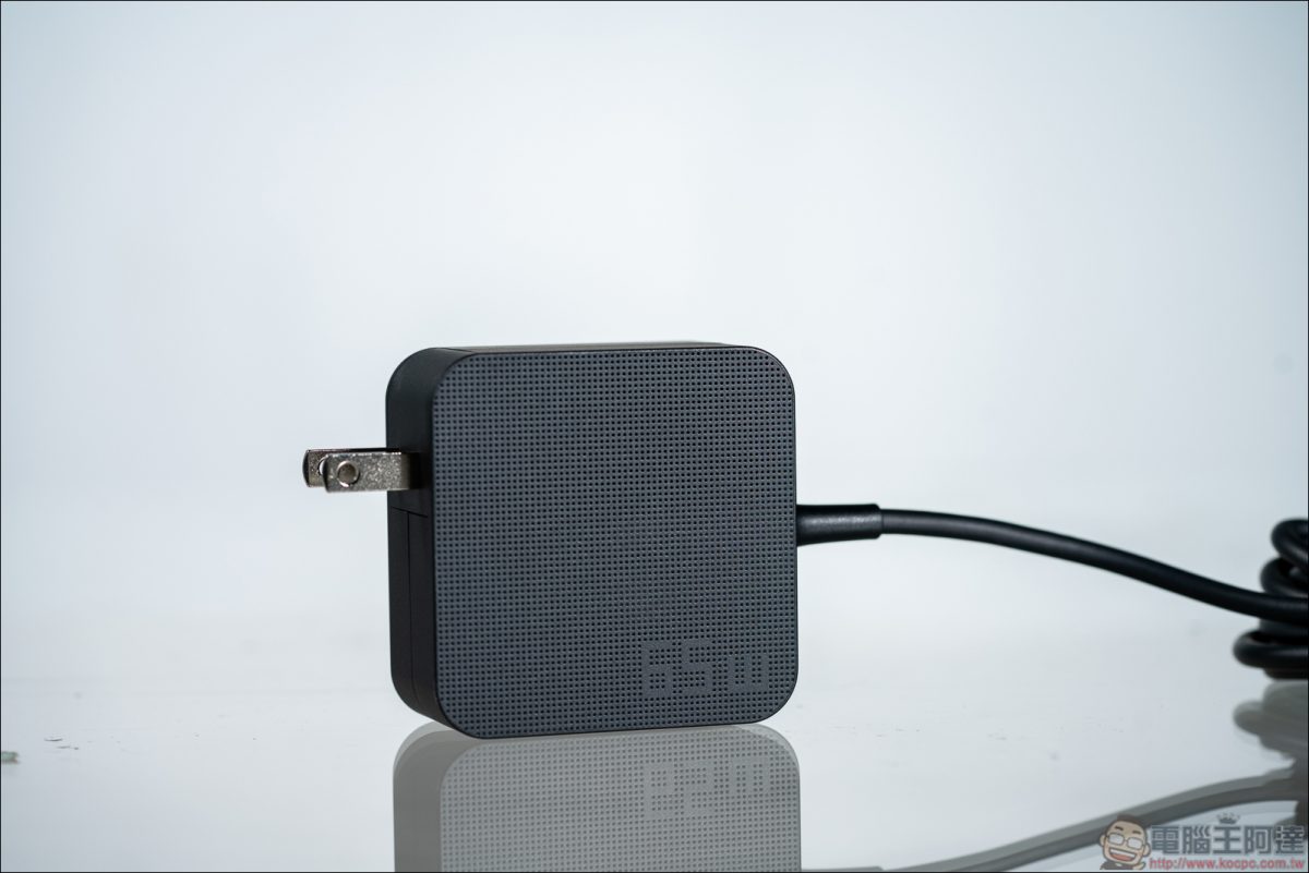 充電器上面寫明了 65 瓦,不只是標示清楚,也呈現出與眾不同的造型。而且細窄的造型也比較方便使用,有些插座或是延長線間隔小得要命,而大多變壓器設計較大難以有效率的用到每一個插座;但是 ASUS ZenBook 13 的窄長充電器就能某種程度避免這個問題,讓充電使用更方便。