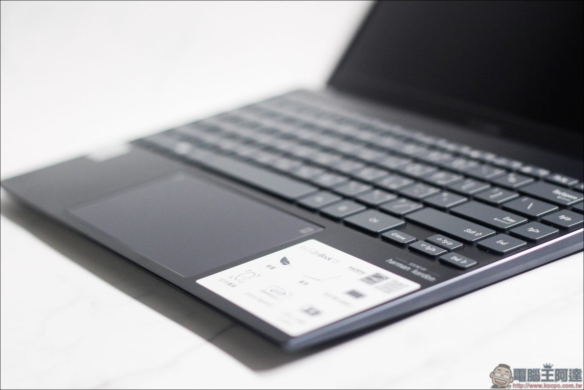 從盒內拿出的 ZenBook 13(UX325),不管正面、側面還是背面都是美得令人驚艷,還沒開機,只要展開 ZenBook 13(UX325),就可以感受到整體的優雅細緻,這次鍵盤與上一代稍有差異,全新的 ZenBook 13(UX325)採用窄邊框且貼合人體工學的鍵盤設計,更大的鍵盤在飛快打字時更舒適,也更方便,而且鍵盤設計美觀,有別於一般薄膜鍵盤,打字時候手感的回饋相當不錯。